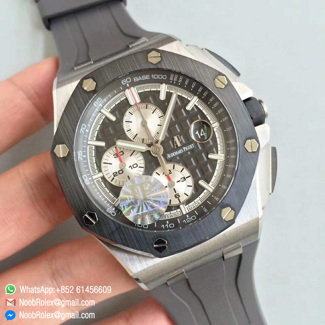 Order Now 2017 AP Royal Oak Offshore 26400IO.OO.A004CA.01 44mm Titanium Case Gray Dial XS Rubber Strap A3126 JF 1:1 High Quality Clone Edition . A titanium edition with harmonised rhodium counters on a slate-grey “Méga Tapisserie” dial and a matching rubber bracelet. The bezel, pushpieces and screw-locked crown are in extremely hard black ceramic.