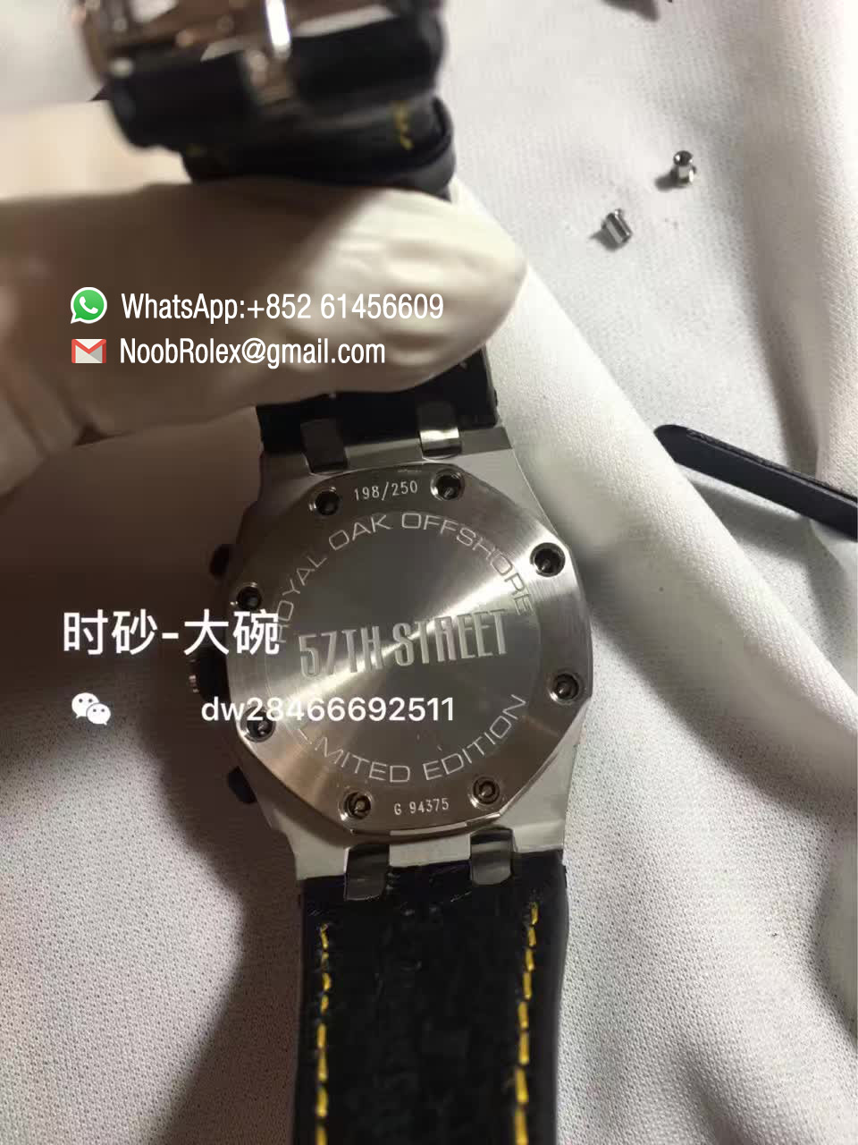 Order Now Absolutely SUPER RARE AP Royal Oak Offshore 57th Street Rubber Clad Chronograph SPECIAL LIMITED BOUTIQUE EDITION of just 250 pieces!!! This watch was produced to commemorate AP’s NY Boutique opening in late 2009 and was exclusively available only out of this Flagship location. Stunning contrast between the 18 Rose Gold, the Black Waffle Dial and the Stainless Steel/Rubber Clad. Even more unique is the AP black alligator hornback strap (with off-white/gold contrast stitching)…this strap is ABSOLUTELY unique to this specific model.