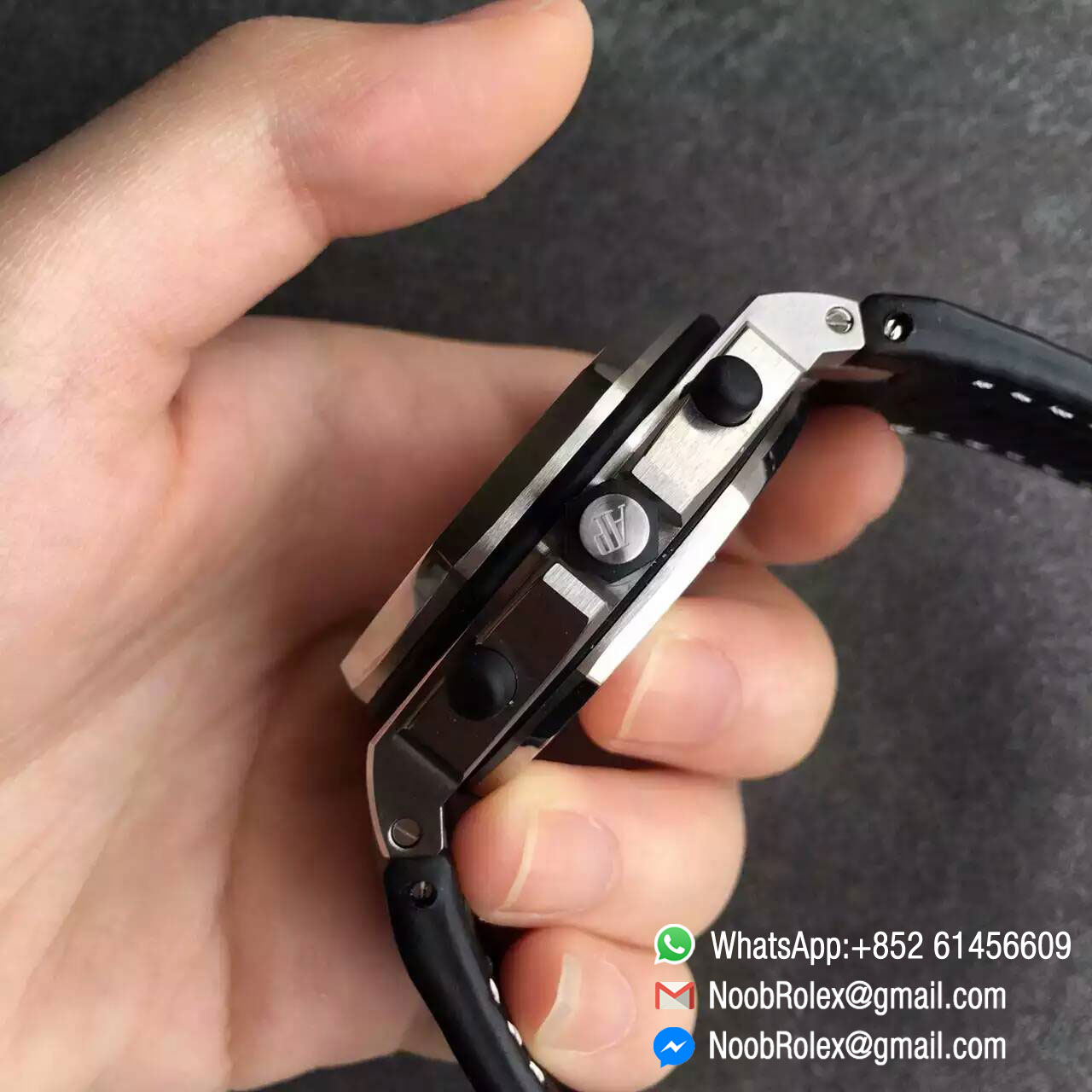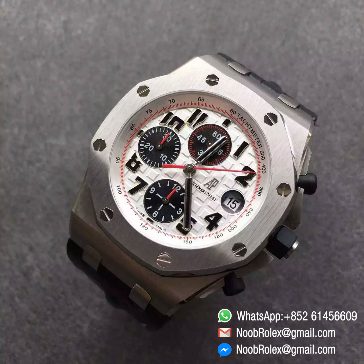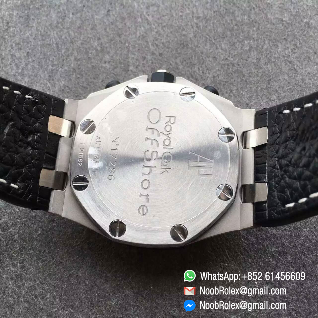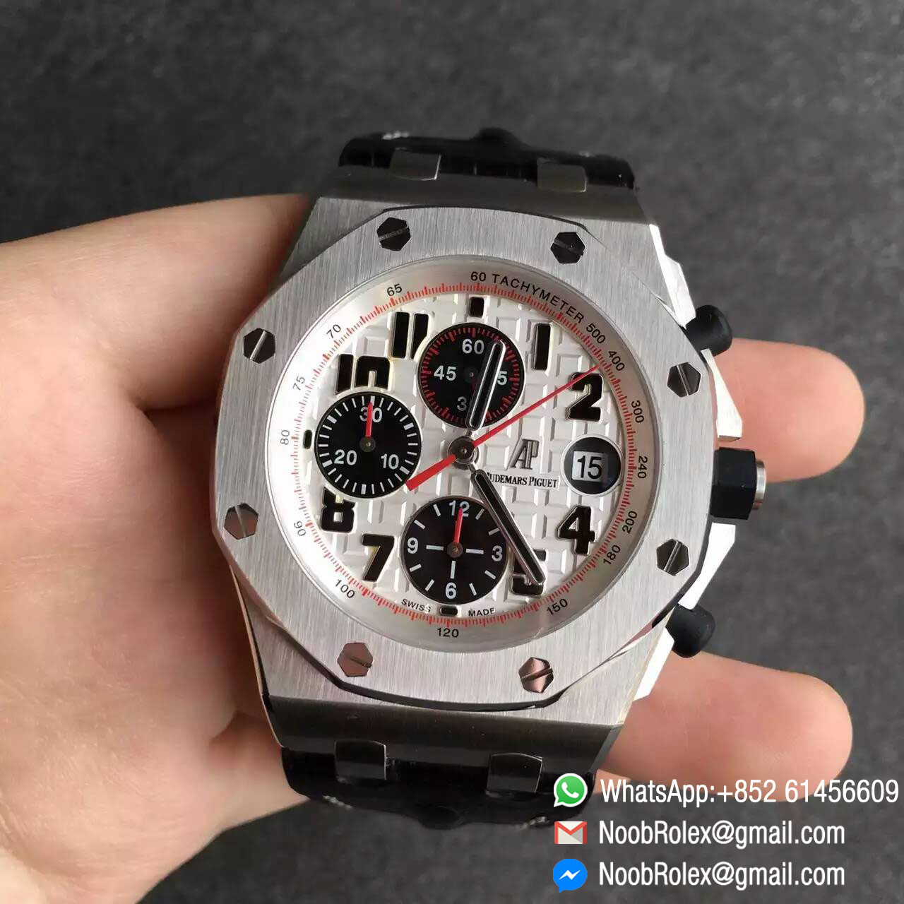 Order Now Selfwinding chronograph with date display and small seconds at 12 o’clock. Stainless steel case, silvered dial, black strap. Royal Oak Offshore Watch 26170ST, 42mm, JF Best Edition, Selfwinding, chronograph, Silver Themes on Black Leather Strap, Asian 7750 Movement.
