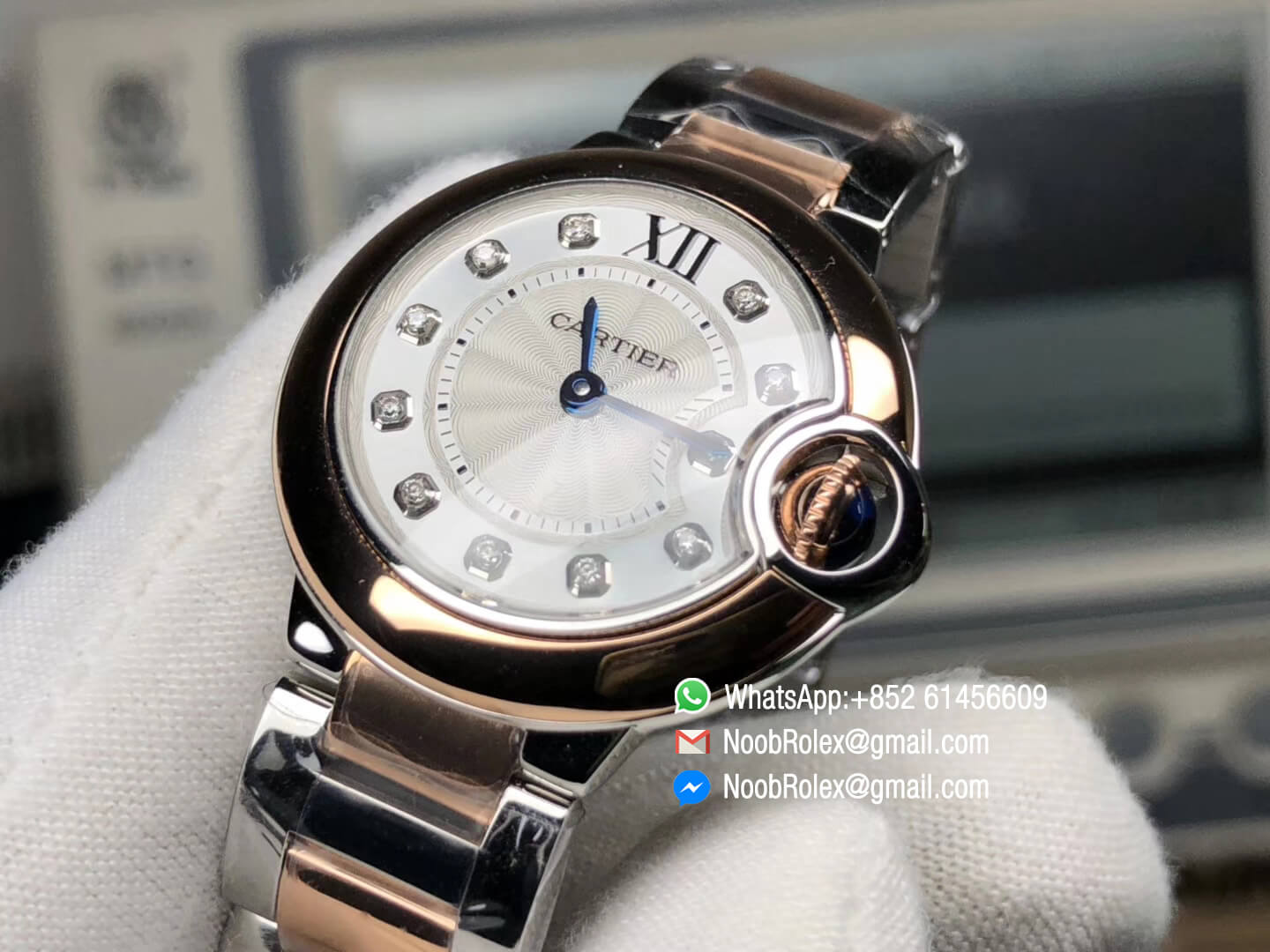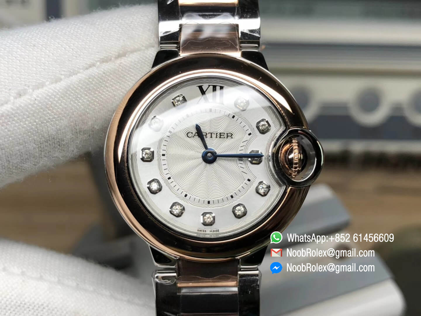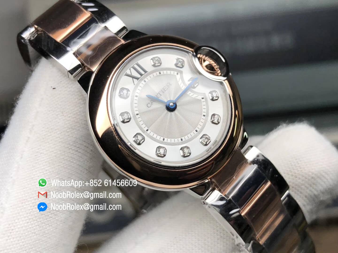Order Now Ballon Bleu 28mm Rose Gold Case Diamonds Markers White Dial on Steel and Rose Gold Two Tone Bracelet Swiss Ronda Quartz.