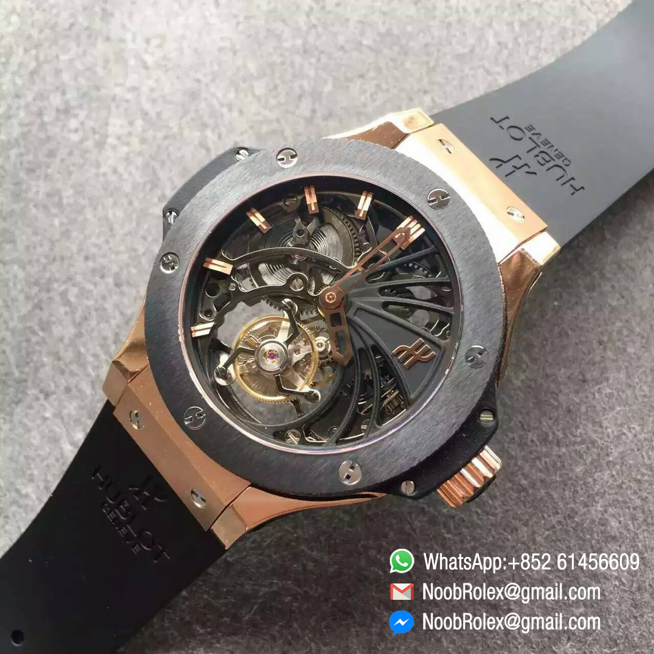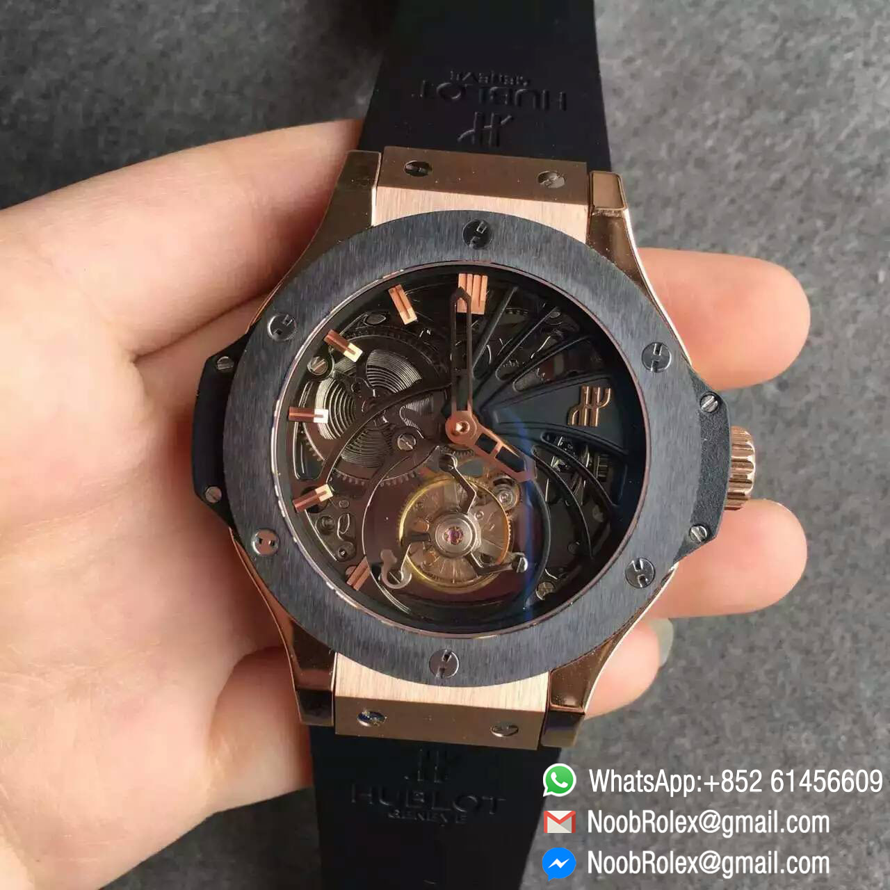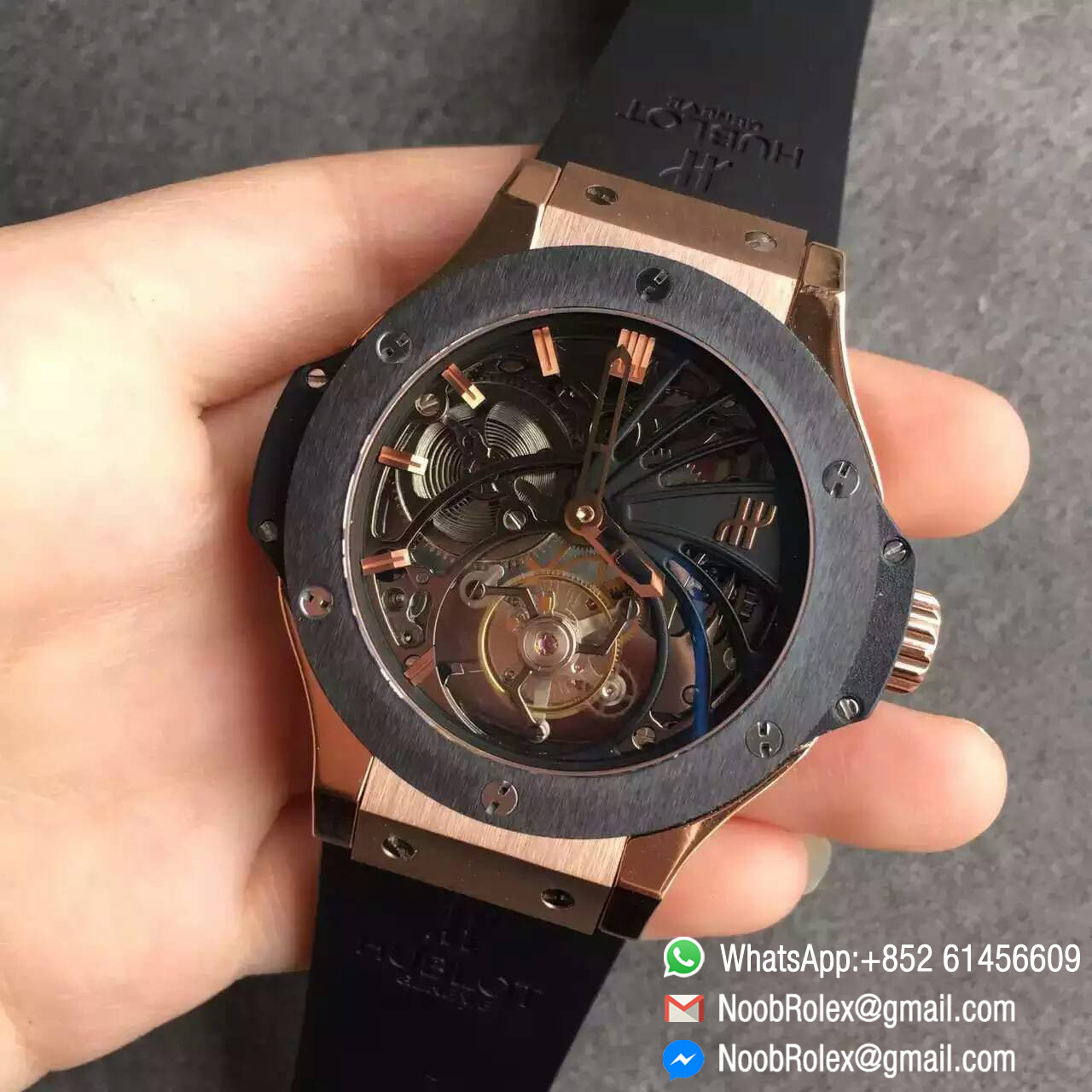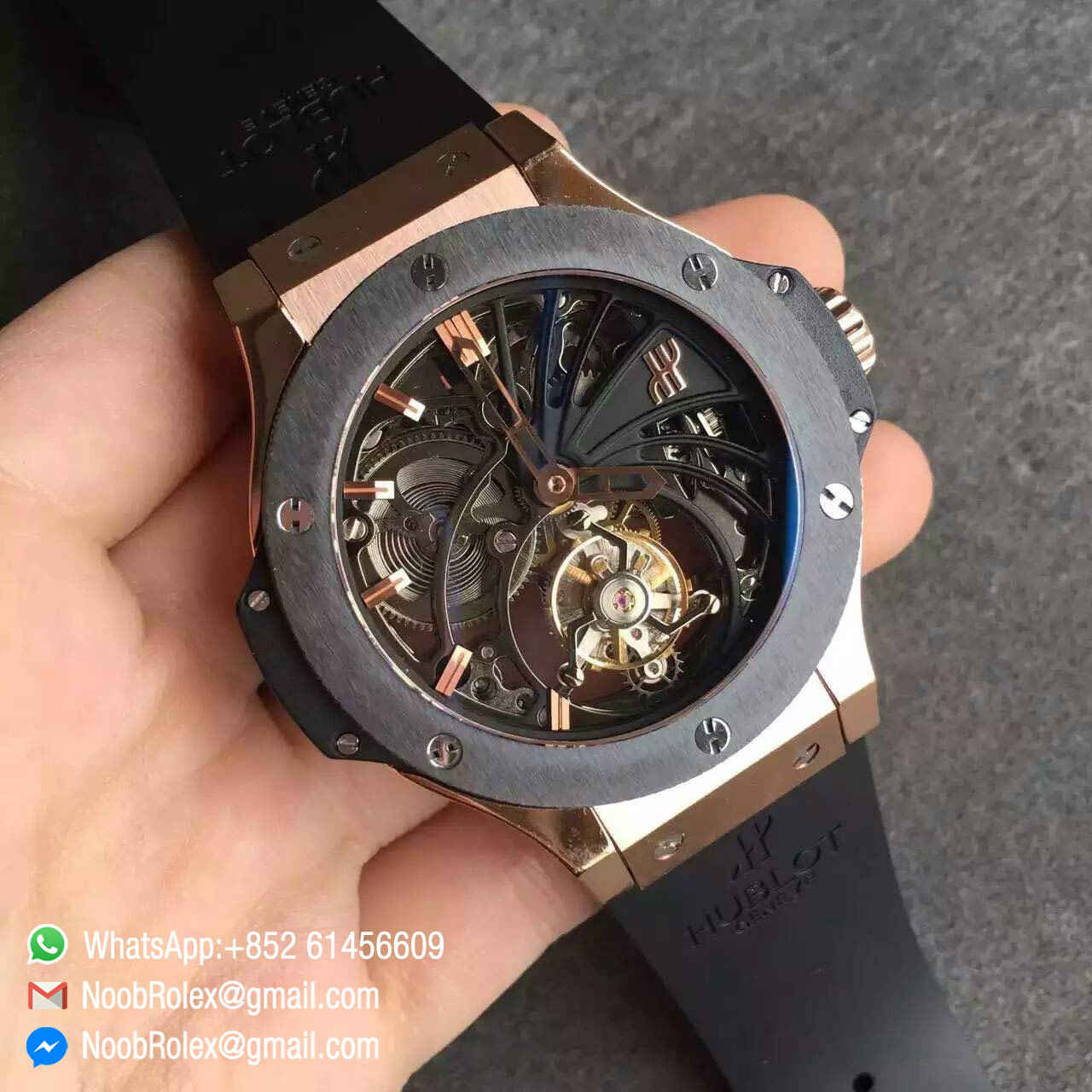 Order Now Big Bang Watch, 44mm, Skeleton Style Design, Real Tourbillon Handwinding Movement, Rose Gold Case, Black Ceramic Bezel, Black Rubber Strap, Limited Edition, H Factory.