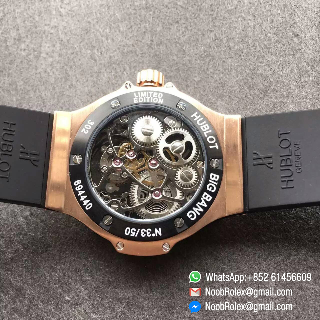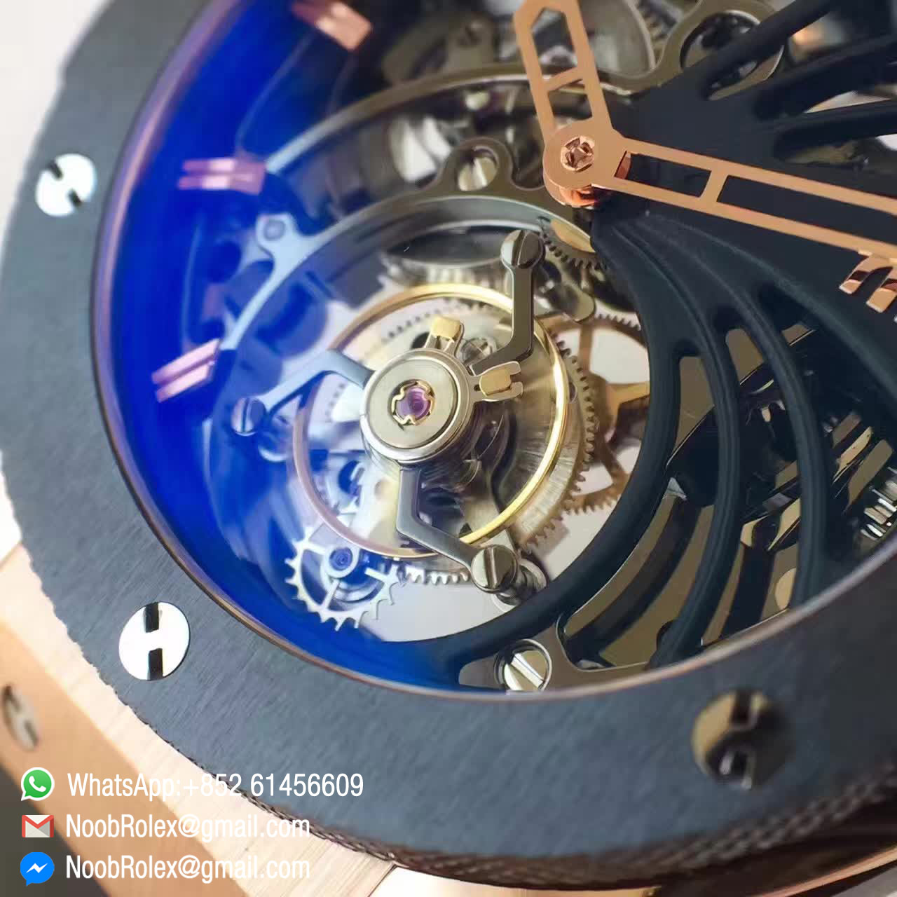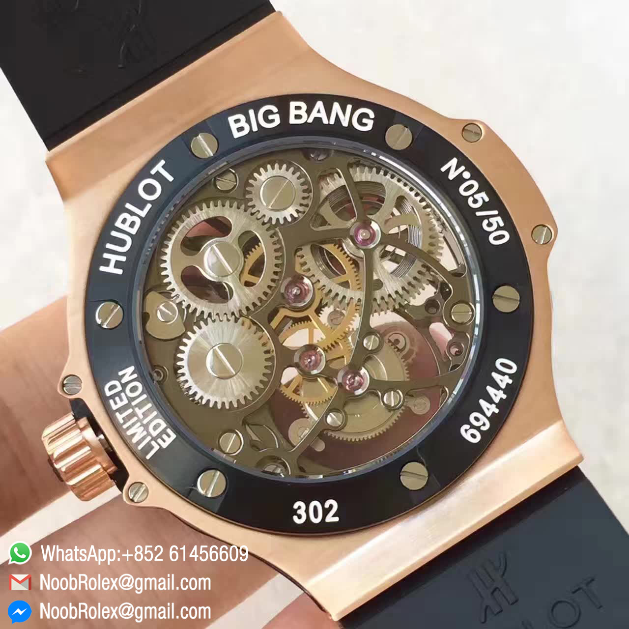 Order Now Big Bang Watch, 44mm, Skeleton Style Design, Real Tourbillon Handwinding Movement, Rose Gold Case, Black Ceramic Bezel, Black Rubber Strap, Limited Edition, H Factory.