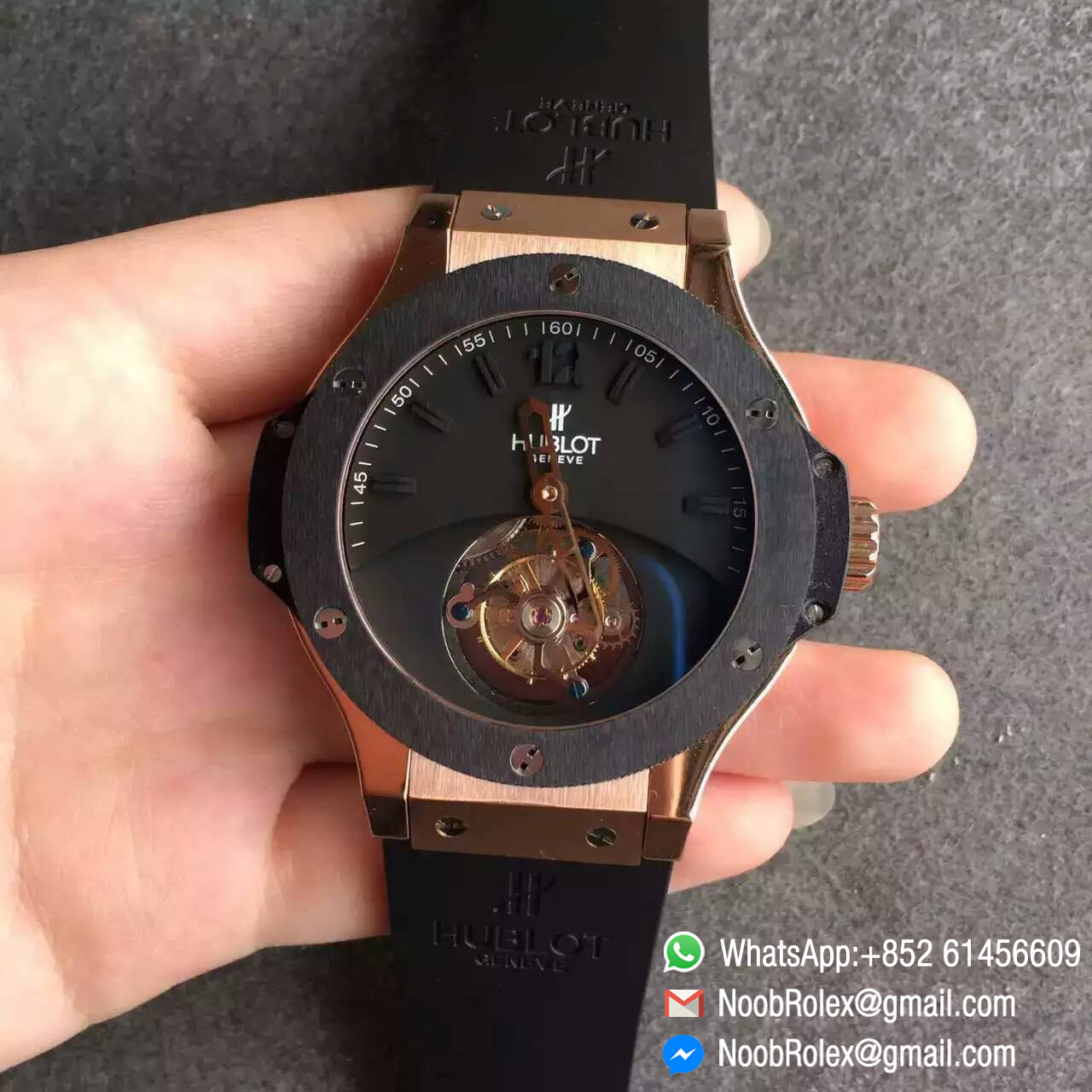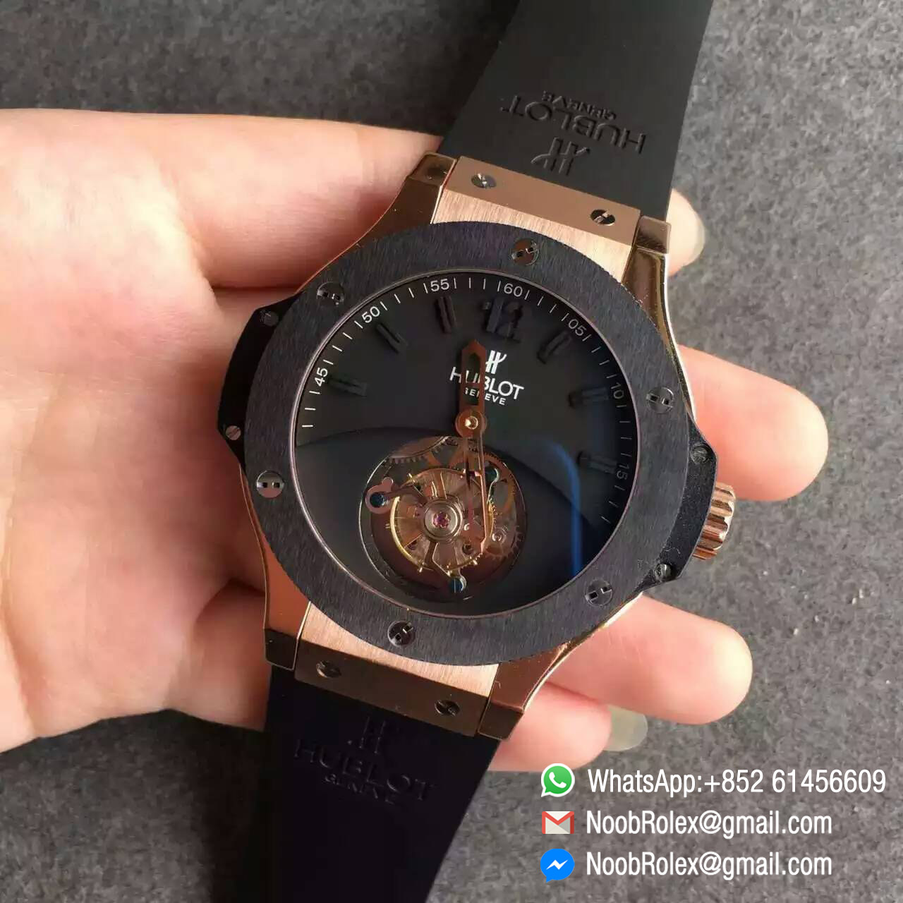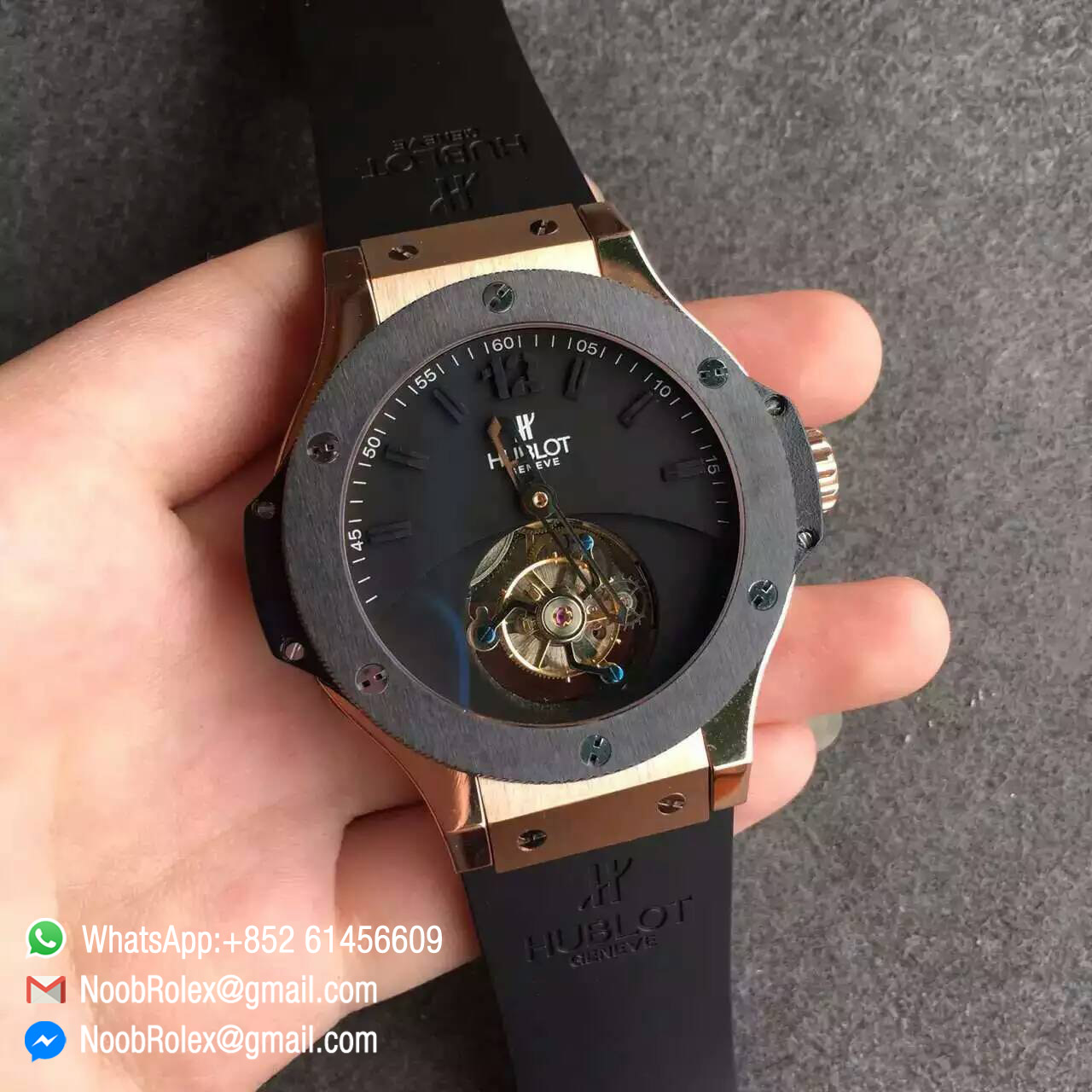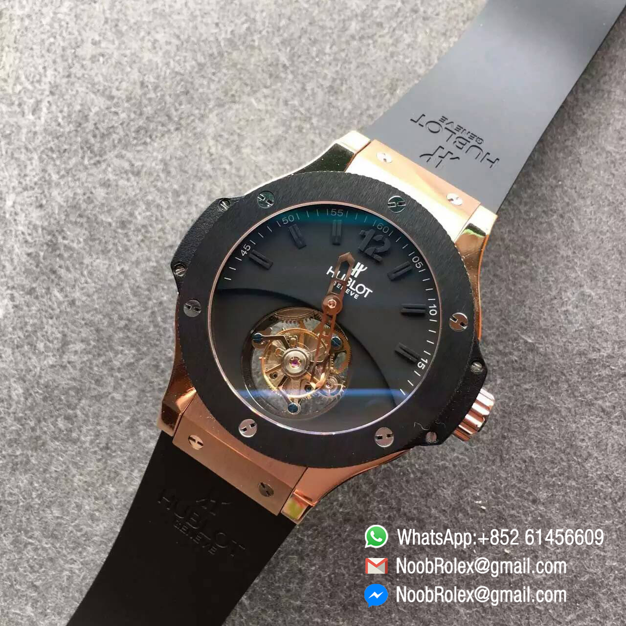 Order Now Big Bang / Solo Bang Collections, real tourbillon watch, Rose Gold Case, Black Ceramic Bezel, Black Carbon Dial and Markers, Asina manual winding movement, HBBV6 factory best quality edition.