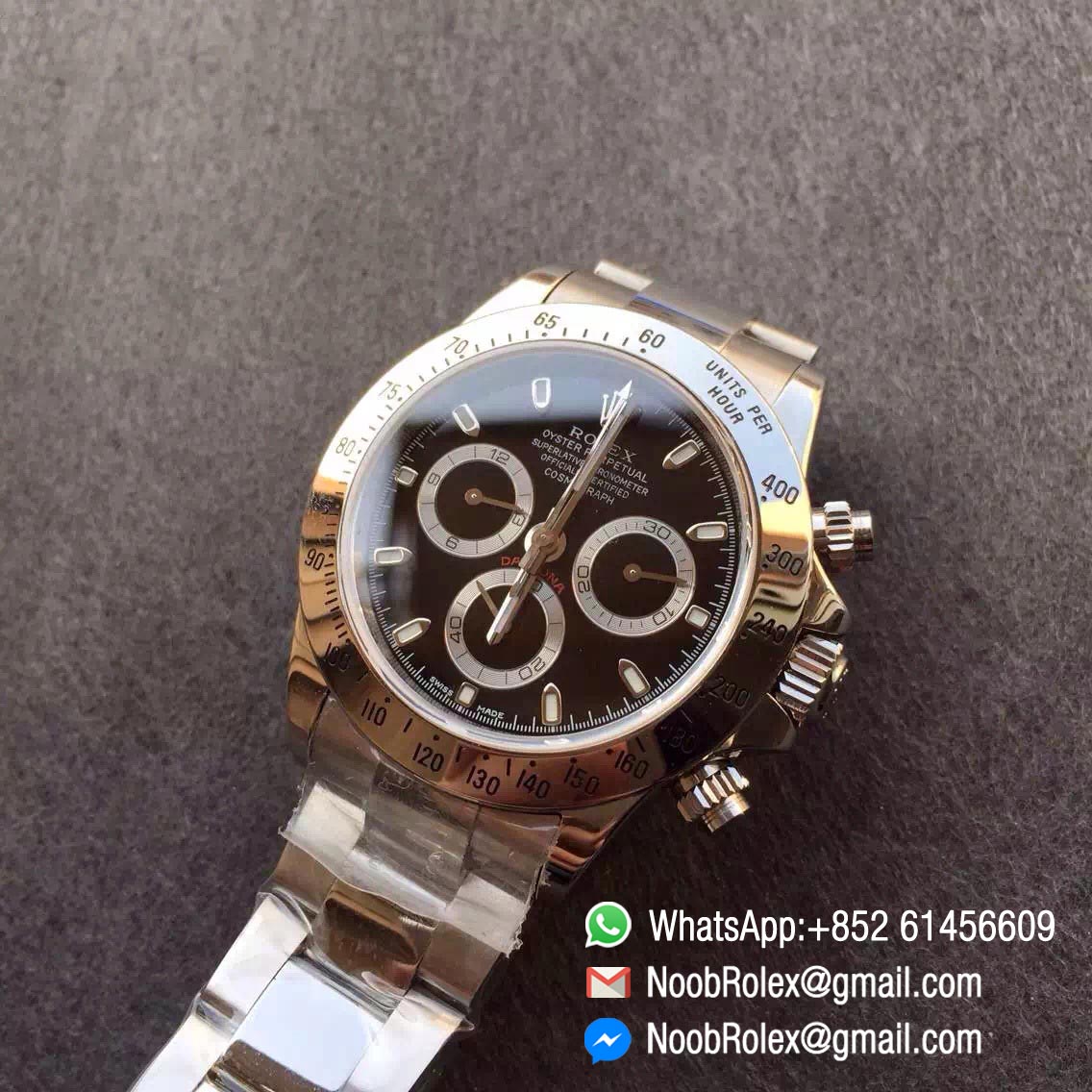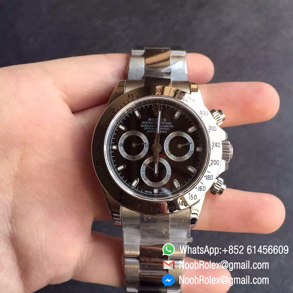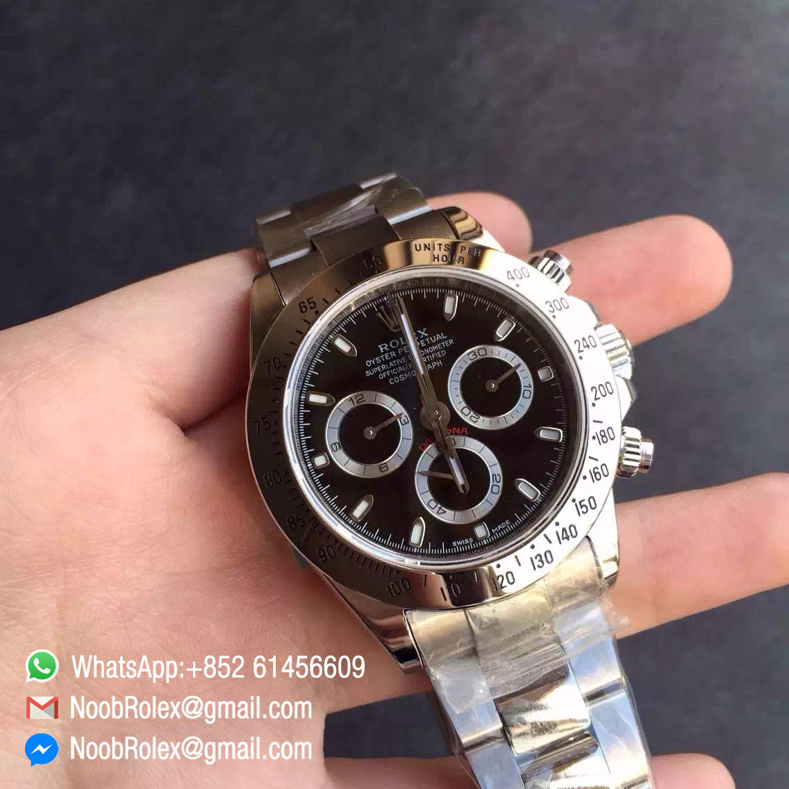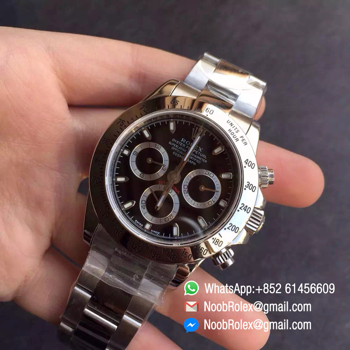 Order Now The Cosmograph Daytona, introduced in 1963, was designed to meet the demands of professional racing drivers. With its highly reliable chronograph and bezel with tachymetric scale, it allows drivers to perfectly measure average speeds up to 400 kilometres or miles per hour, as they choose. An icon eternally joined in name and function to the high performance world of motor sport. Daytona Watch 116520, JF Factory 1:1 Best Edition, with Stainless Steel Bezel and Black Dial on Steel Bracelet, Asian 7750 Chrono Automatic Movement, Free Shipping by DHL.