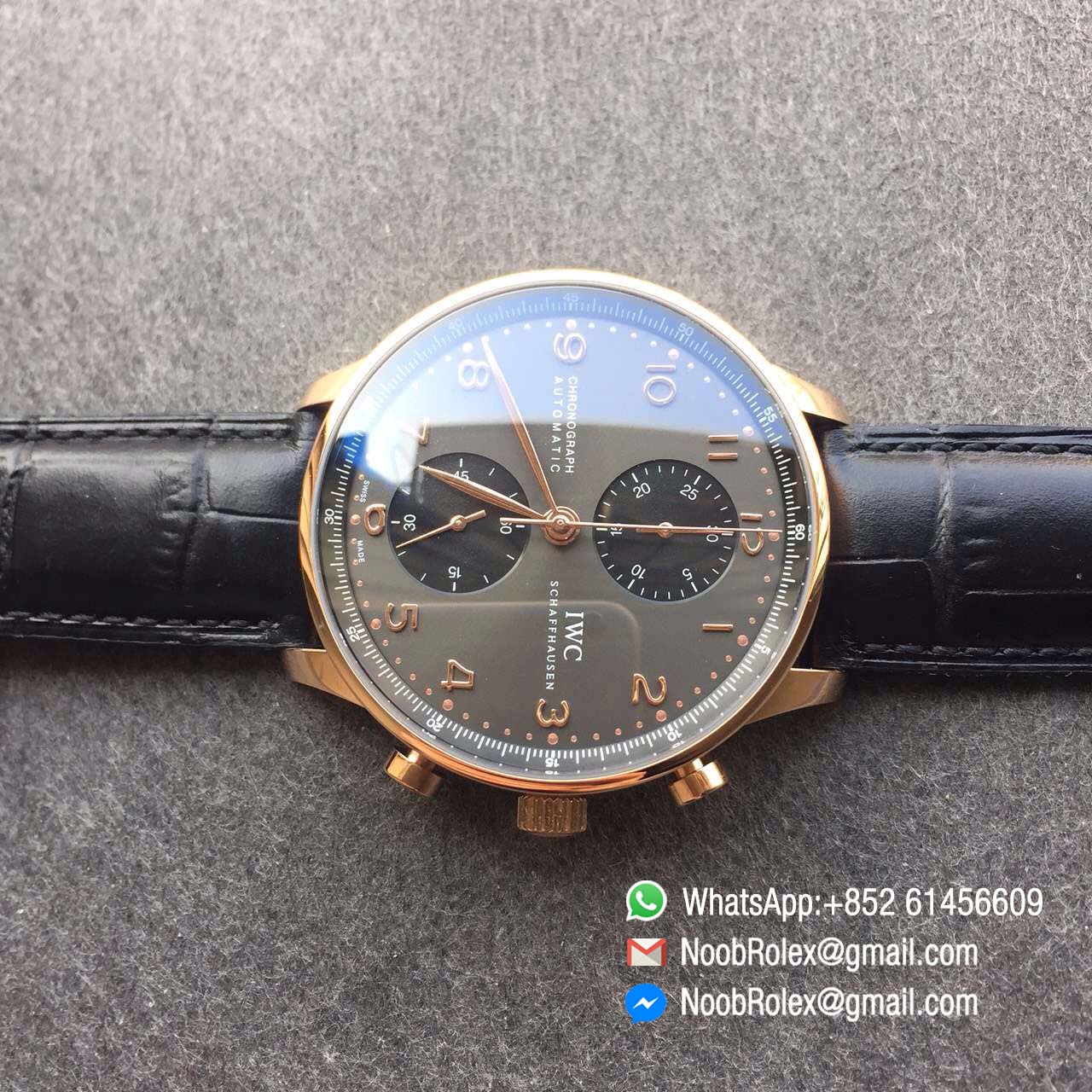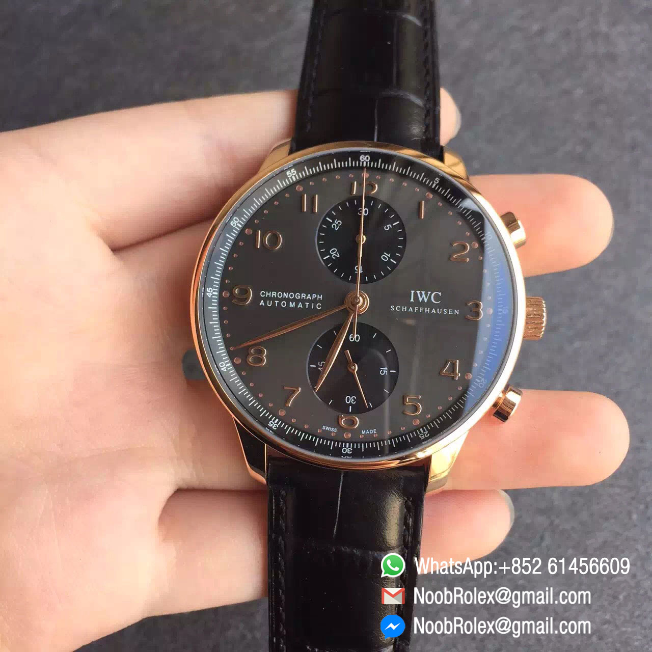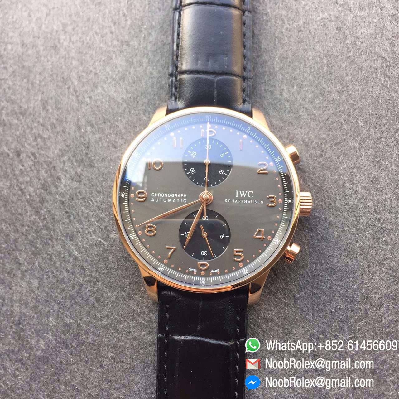 Order Now The Portugieser Chronograph has been the most sought-after model in the Portugieser family since 1998. Stylish and sophisticated, Its moderate diameter of 40.9 millimetres also makes it ideal for a slimmer wrist, Slate-coloured dial with shimmering sun pattern guilloche work. Available in gold or stainless-steel case. Portugieser Chronograph Automatic Watch: IW371482, Stainless Steel Case, Ardoise Dial, Red Gold Markers, on Black Leather Strap, Base on Asian 7750 Movement.