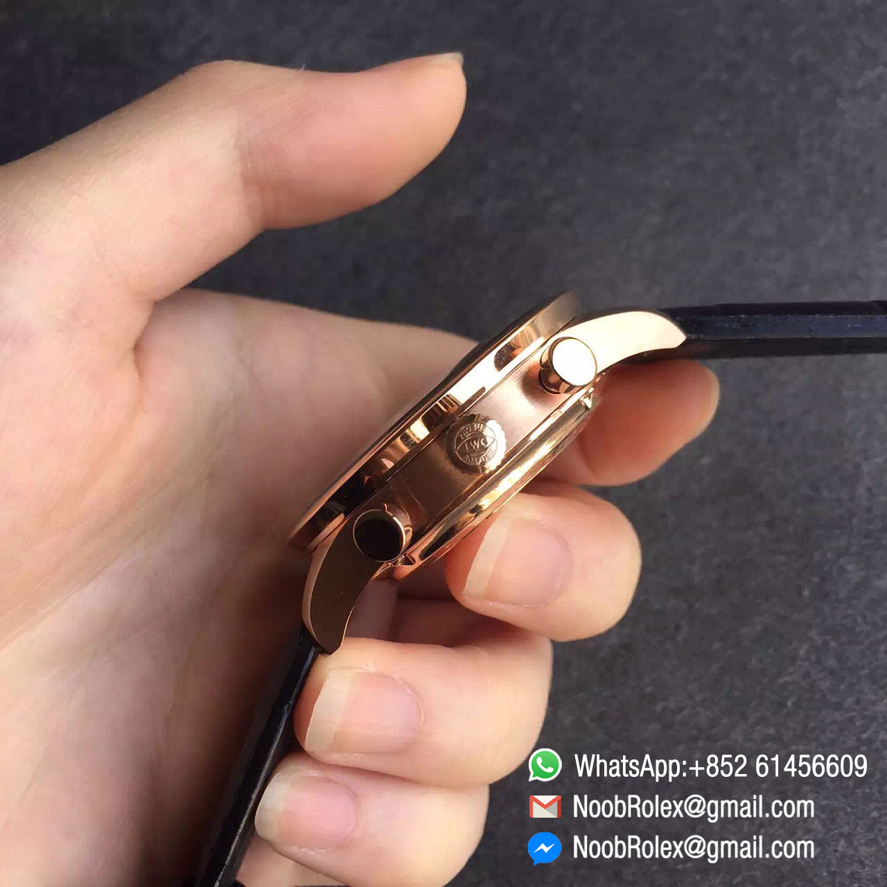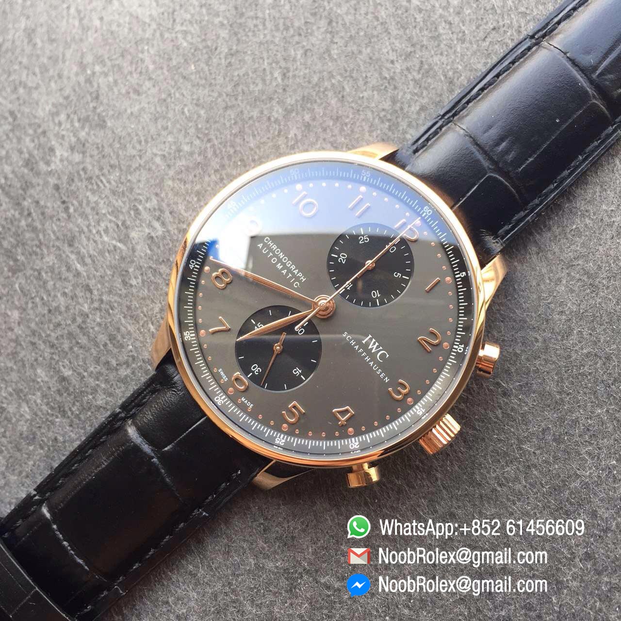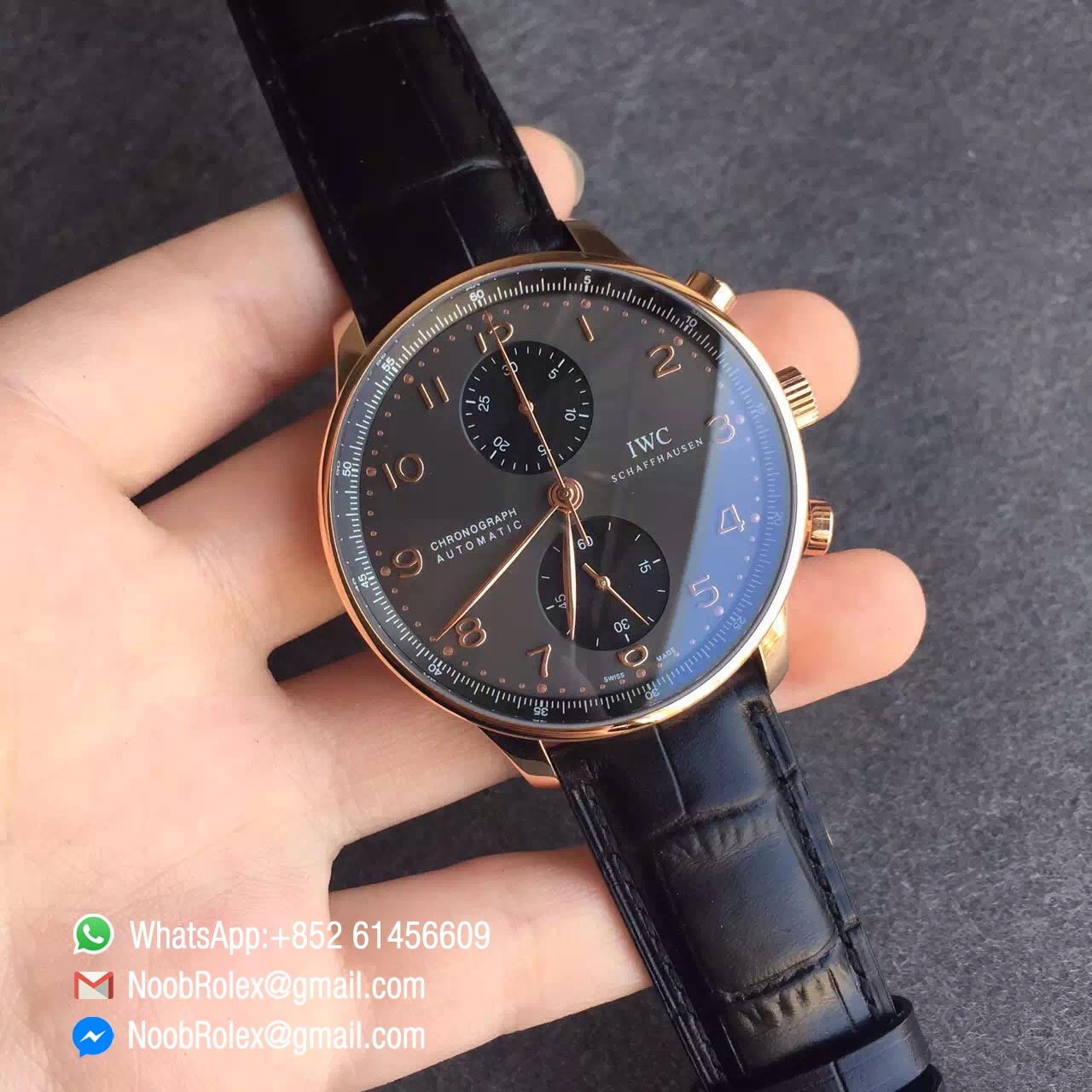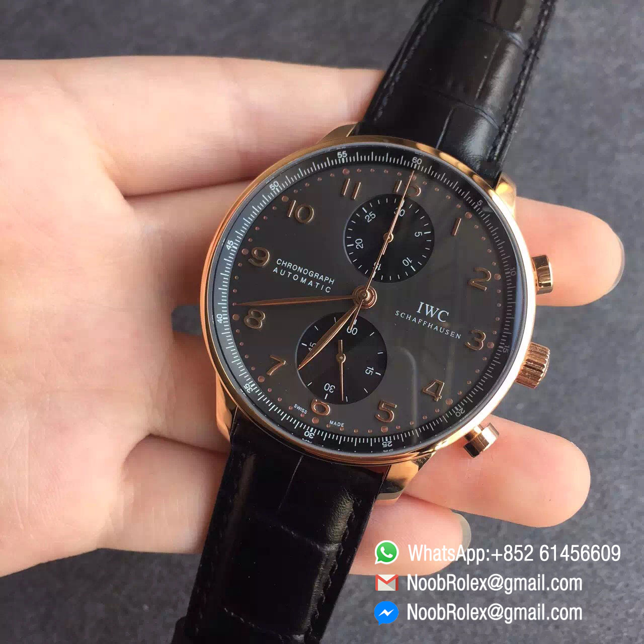 Order Now The Portugieser Chronograph has been the most sought-after model in the Portugieser family since 1998. Stylish and sophisticated, Its moderate diameter of 40.9 millimetres also makes it ideal for a slimmer wrist, Slate-coloured dial with shimmering sun pattern guilloche work. Available in gold or stainless-steel case. Portugieser Chronograph Automatic Watch: IW371482, Stainless Steel Case, Ardoise Dial, Red Gold Markers, on Black Leather Strap, Base on Asian 7750 Movement.