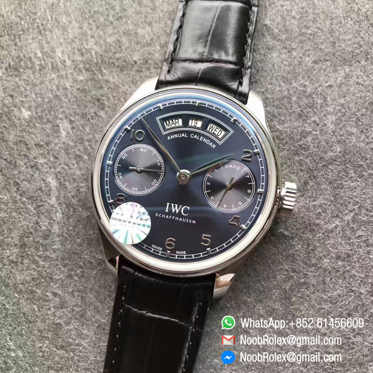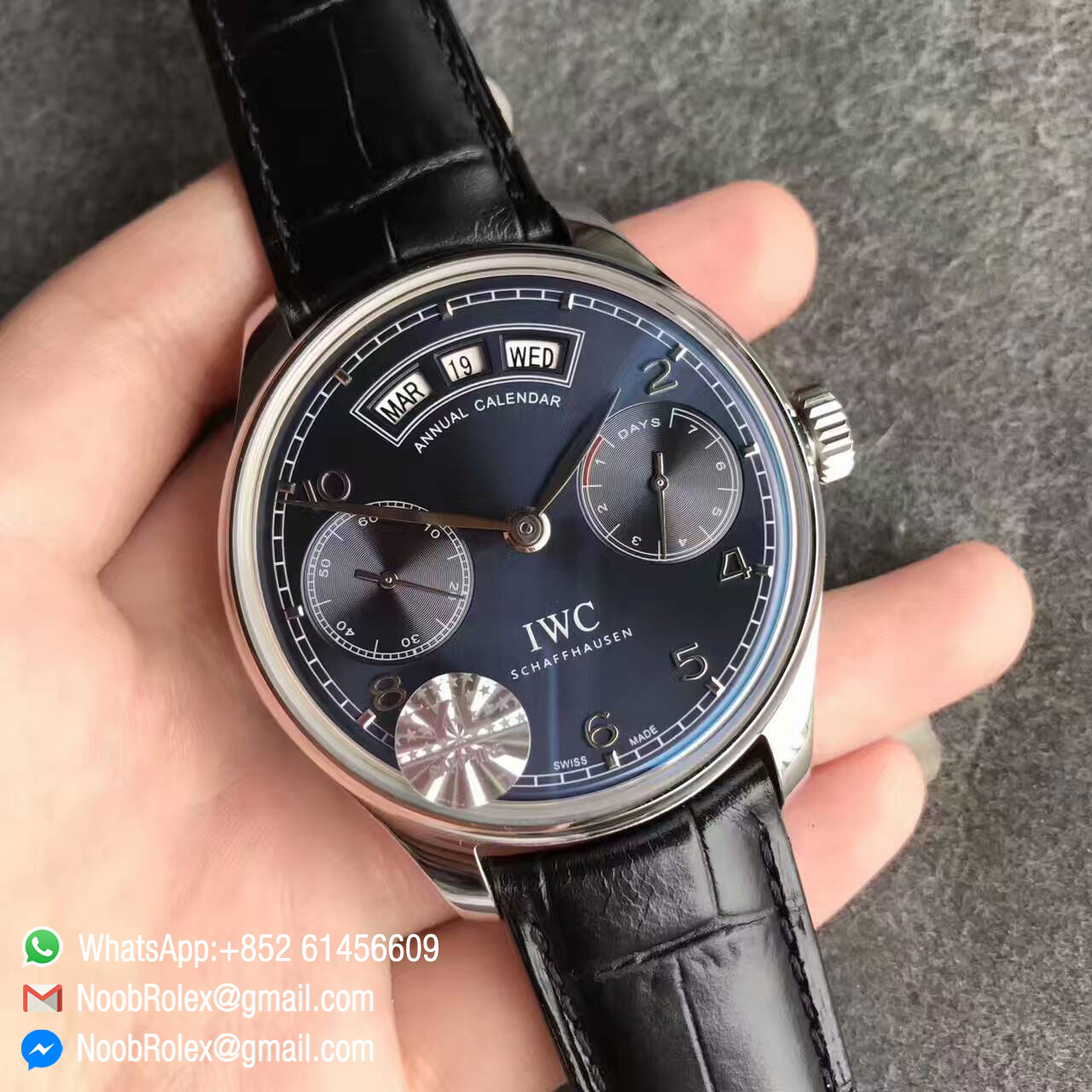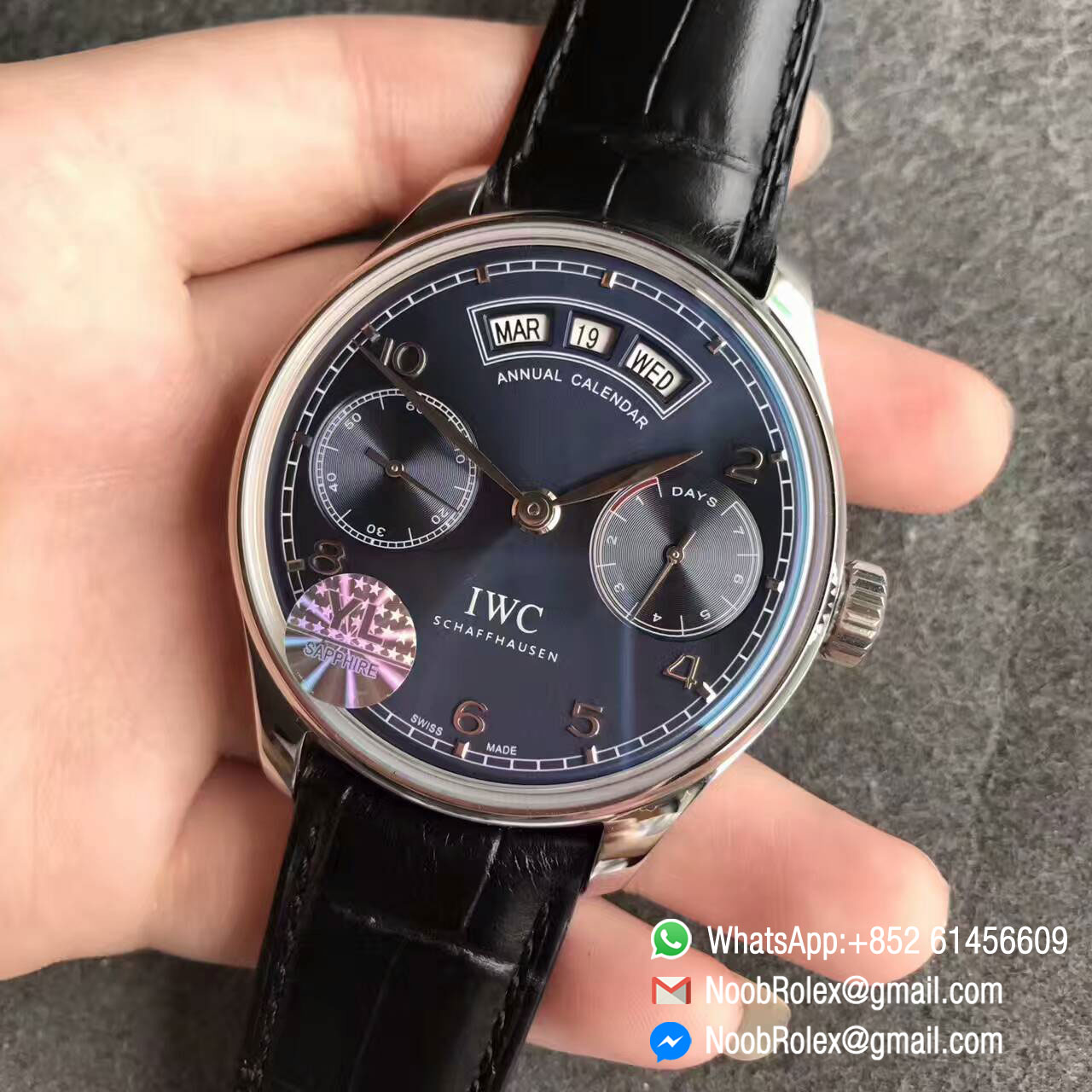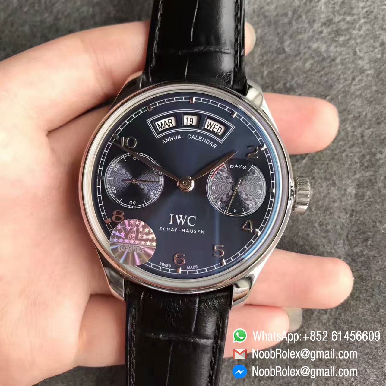 Order Now The first IWC Portuguese Power Reserve Annual Calendar Watch: IW503502, made by YLF, High Quality Replica wristwatch, with Blue Dial and Black Leather Strap. New Asian Clone 52850 Movement.