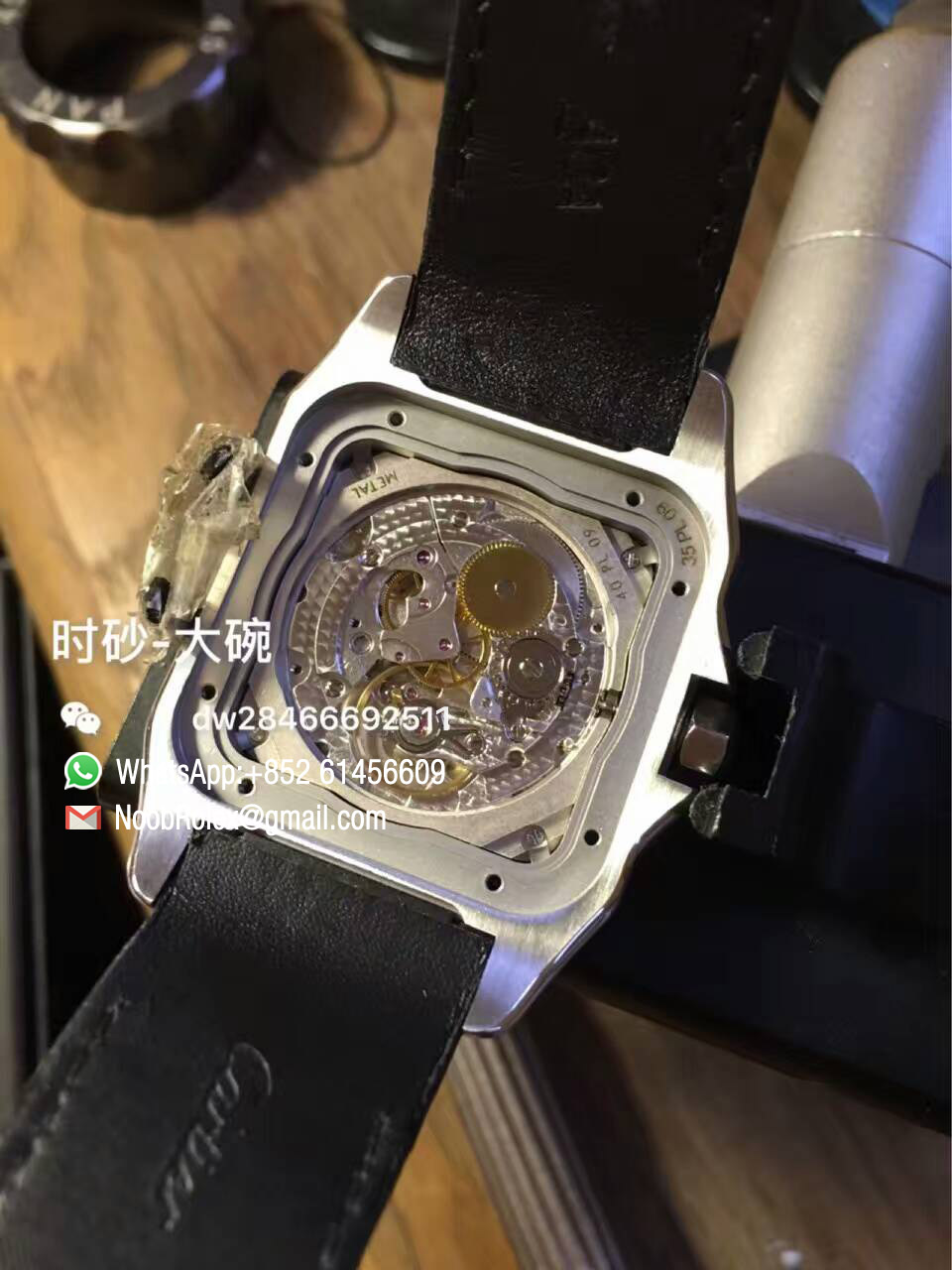 Santos 100 watch, large model, mechanical movement with automatic winding. Steel case, 7-sided crown decorated with a faceted synthetic spinel, silvered opaline dial, black oxidized steel sword-shaped hands with luminescent coating, sapphire crystal, black leather strap with XL triple folding steel buckle. Case dimensions: 51.1 mm x 42 mm, thickness: 10.34 mm. Water-resistant to 3 ATM.