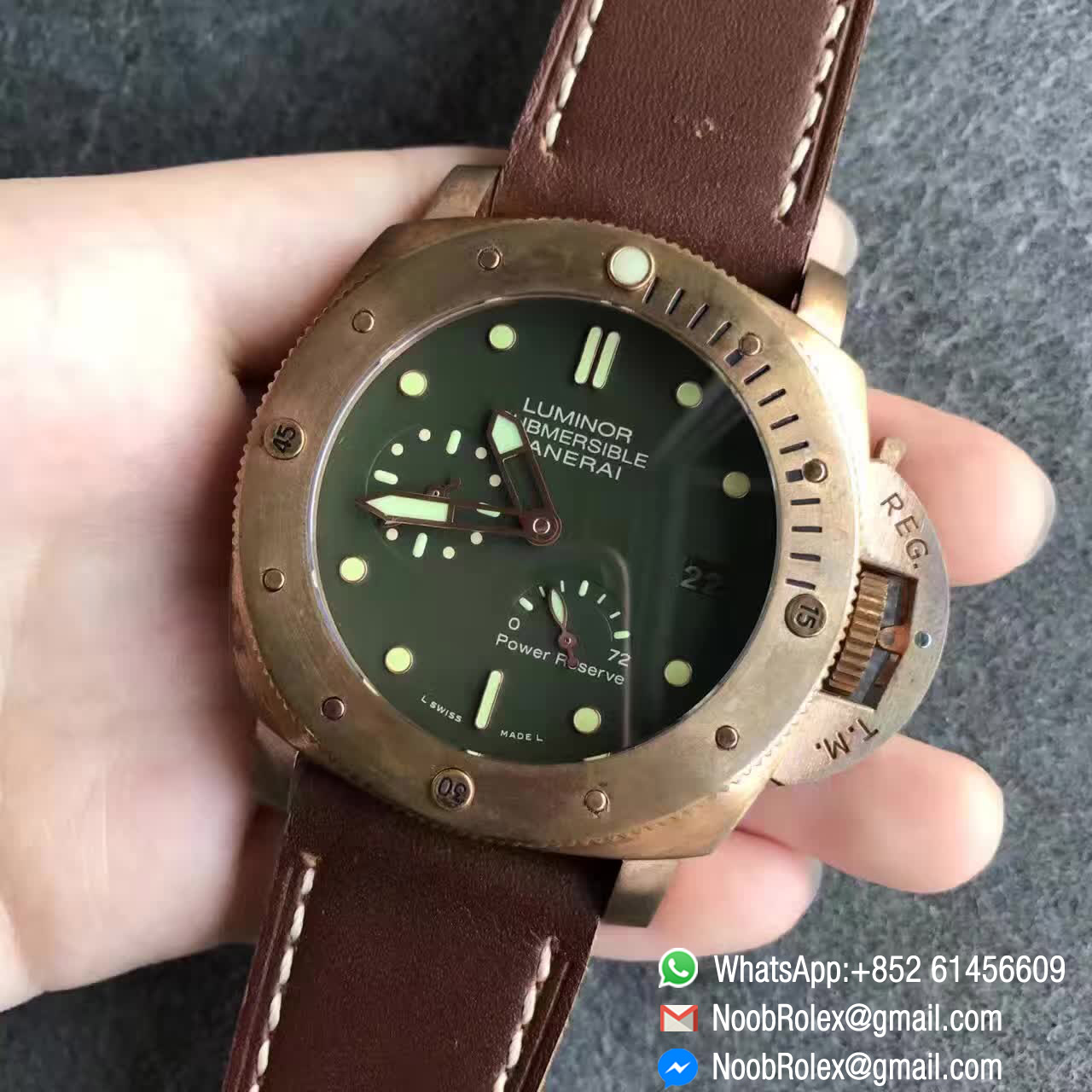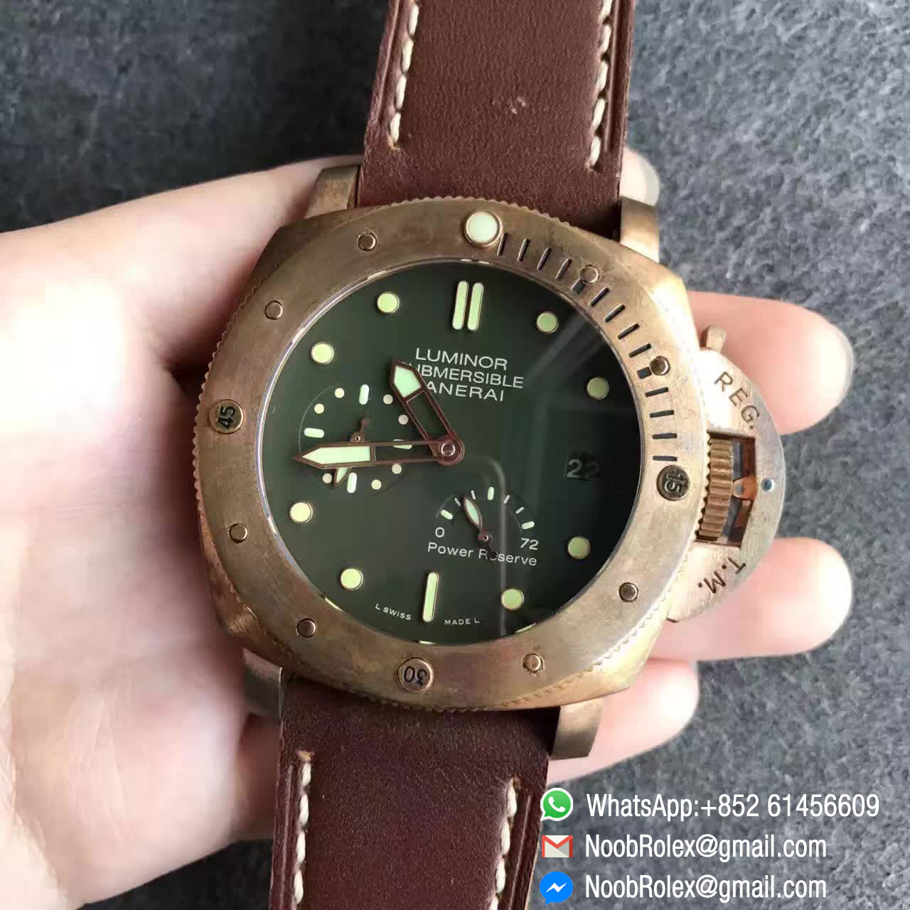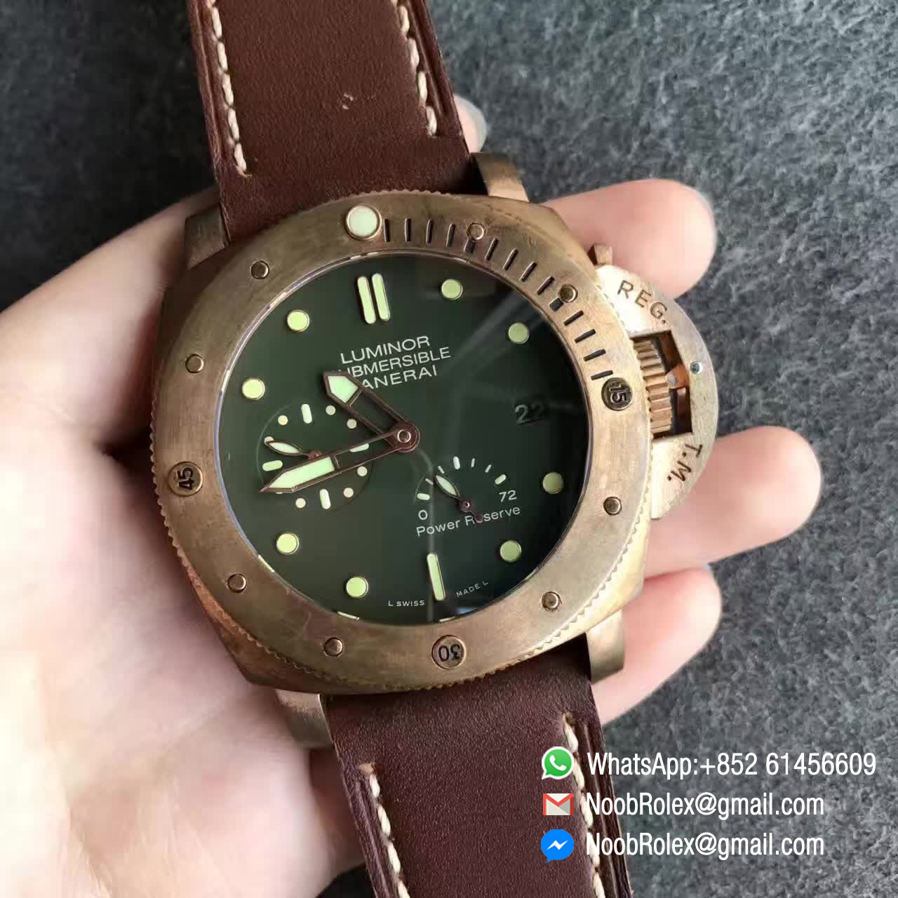 Order Now Luminor Submersible Panerai Watch: PAM00507, it is made by V6F factory, and it is the best quality V2 edition, Real brushed Bronzo Case, Dark Green Dial, and real working Power Reserve, On Brown Leather Strap, Asian P9002 Movement.