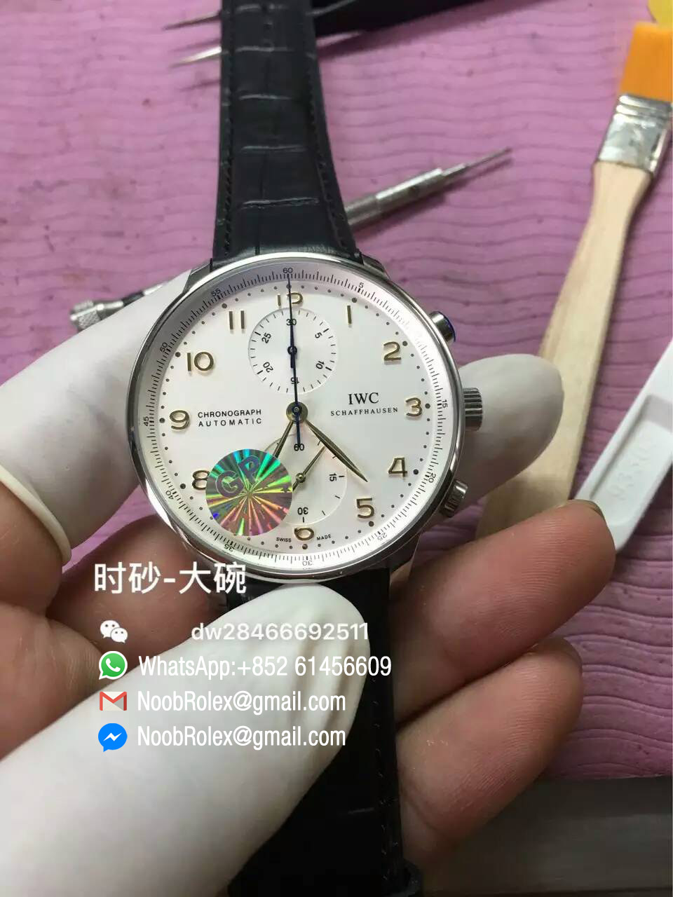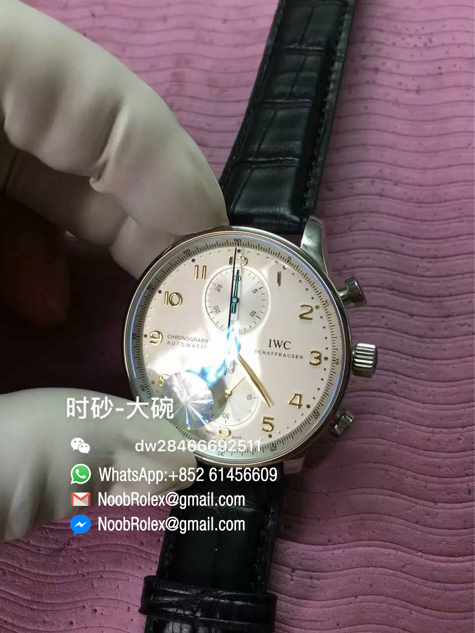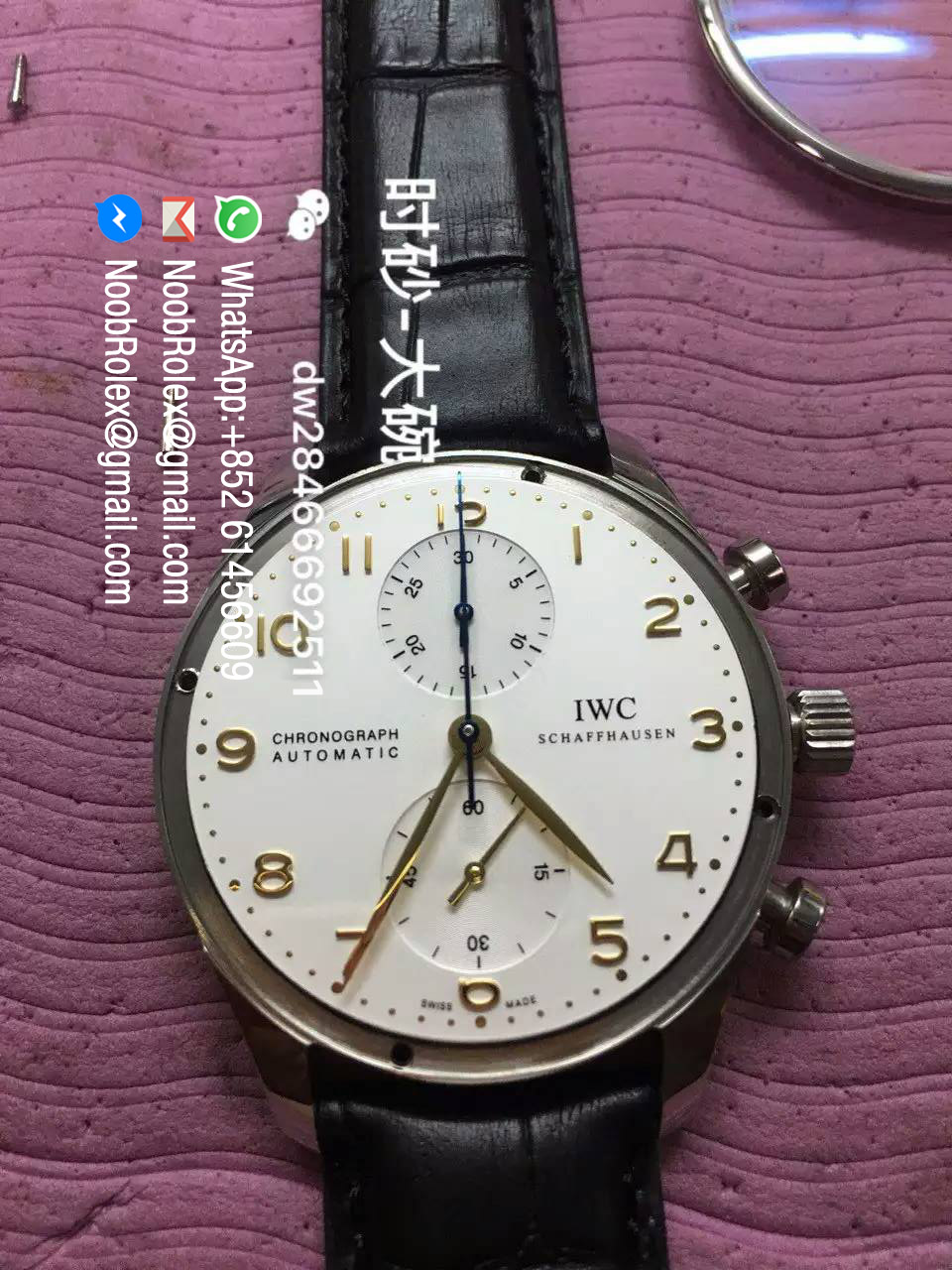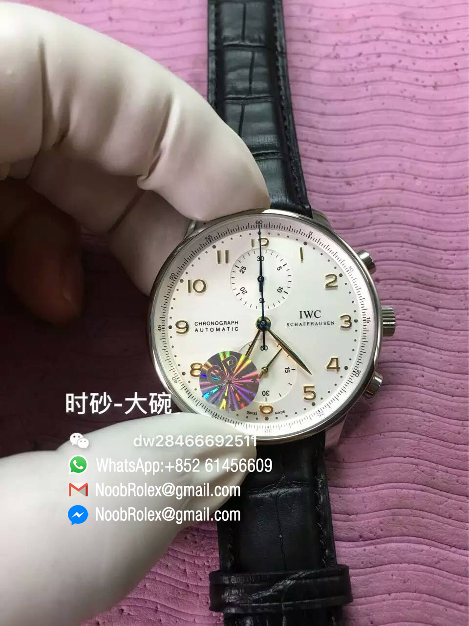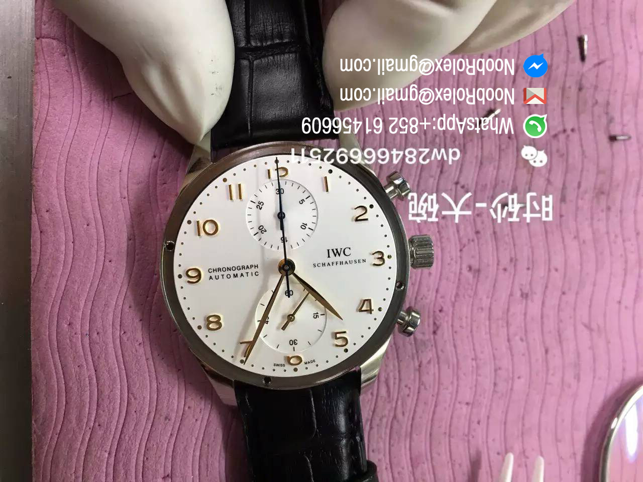 Order Now The Portugieser Chronograph has been the most sought-after model in the Portugieser family since 1998. Stylish and sophisticated, Its moderate diameter of 40.9 millimetres also makes it ideal for a slimmer wrist, Slate-coloured dial with shimmering sun pattern guilloche work. Available in gold or stainless-steel case. Portugieser Chronograph Automatic Watch: IW371445, Stainless Steel Case, White (silver-plated) Dial, Gold Markers, on Black Leather Strap, Base on Asian 7750 Movement.