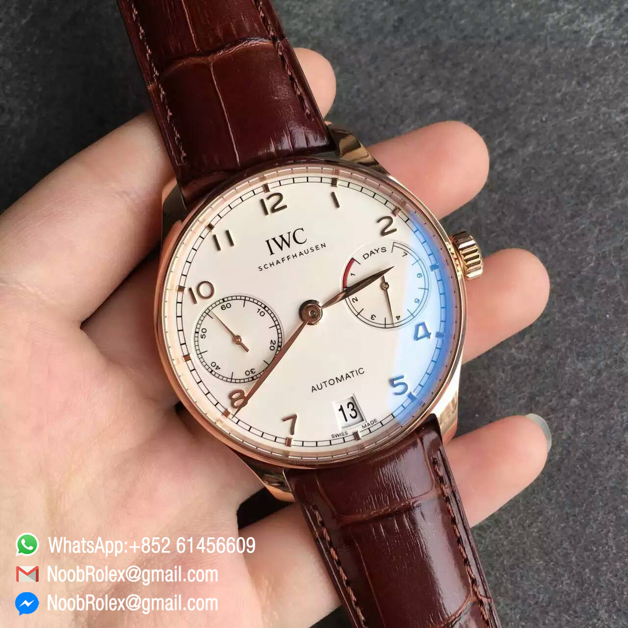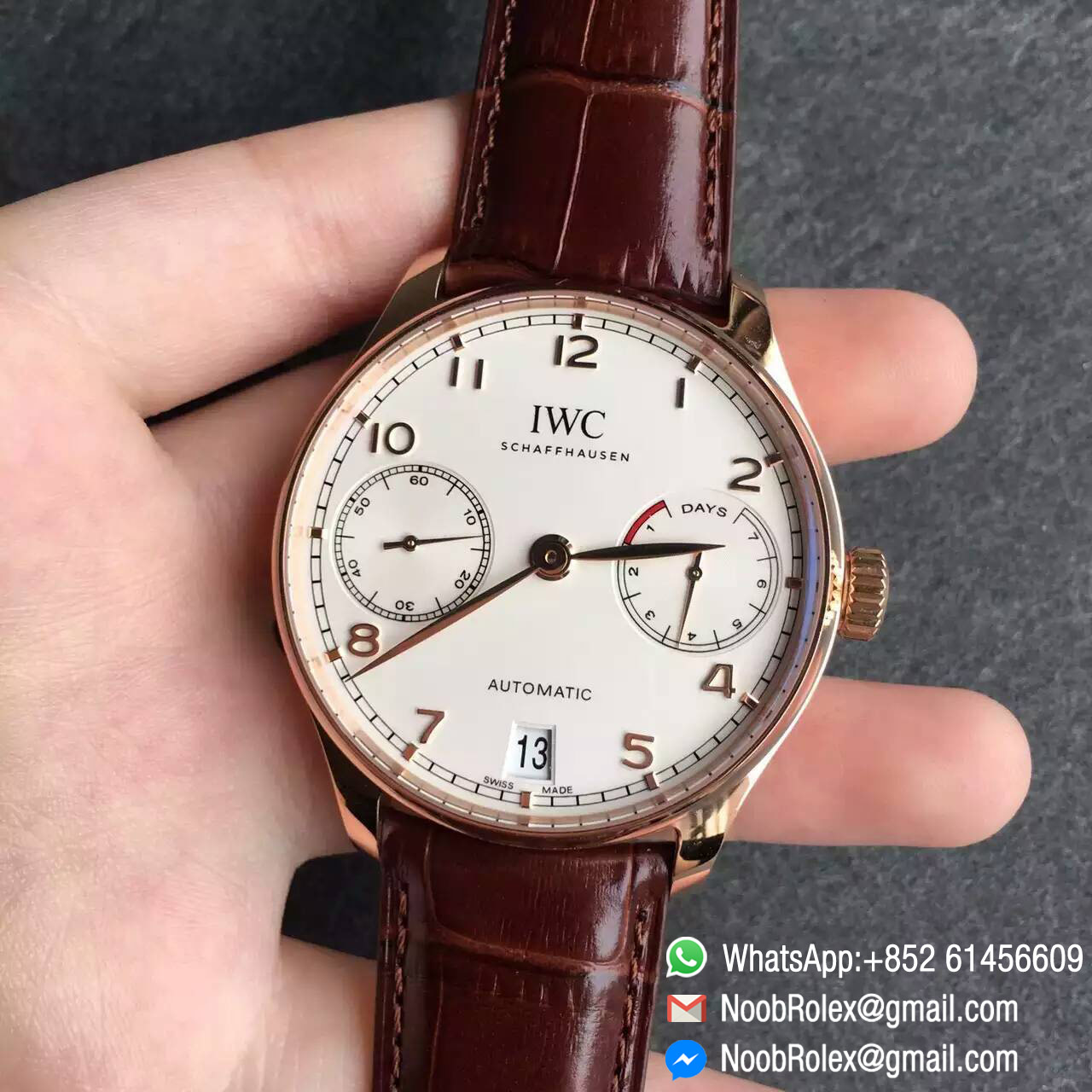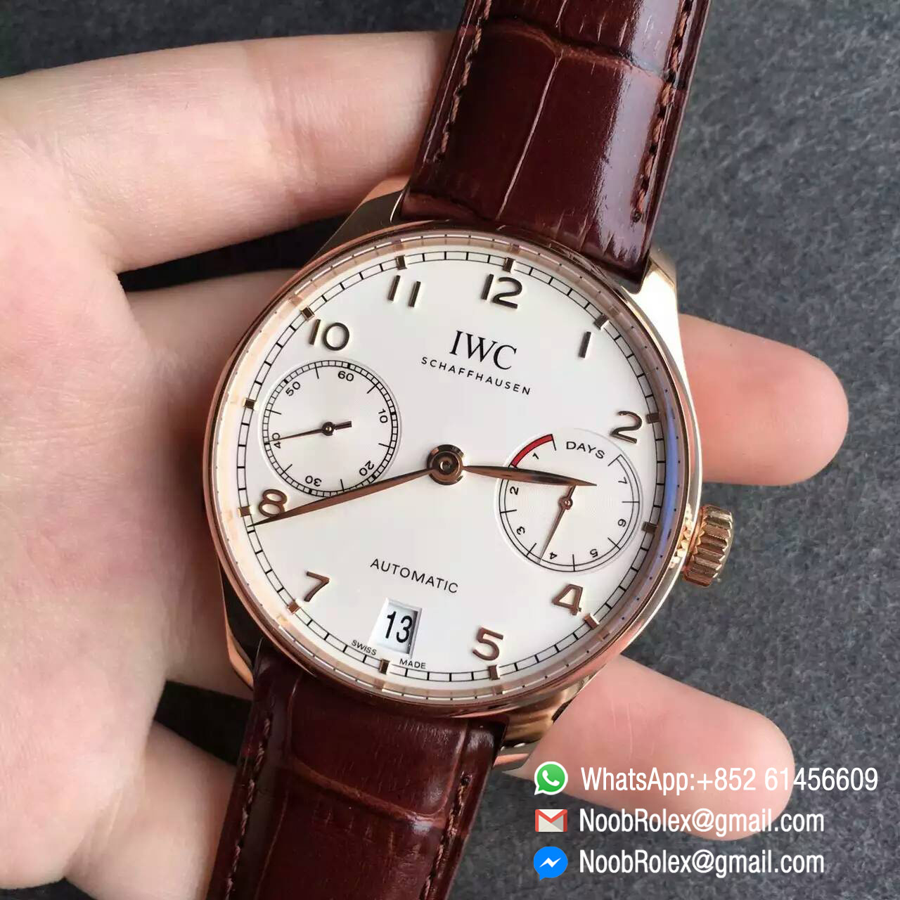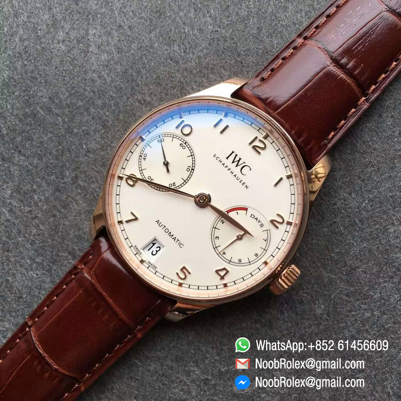 Order Now The Portugieser Automatic is one of the style icons of modern haute horlogerie. Its classic design retains the charm and appeal of the legendary original Portugieser from the 1930s. Unmistakable design cues: a simple railway-track-style chapter ring, appliquéd Arabic numerals, and slender feuille hands. The IWC calibre with new ceramic components. The bridges are decorated with Geneva stripes and circular graining. The winding pawls, automatic wheel and rotor bearing are made of virtually non-wearing ceramic.
