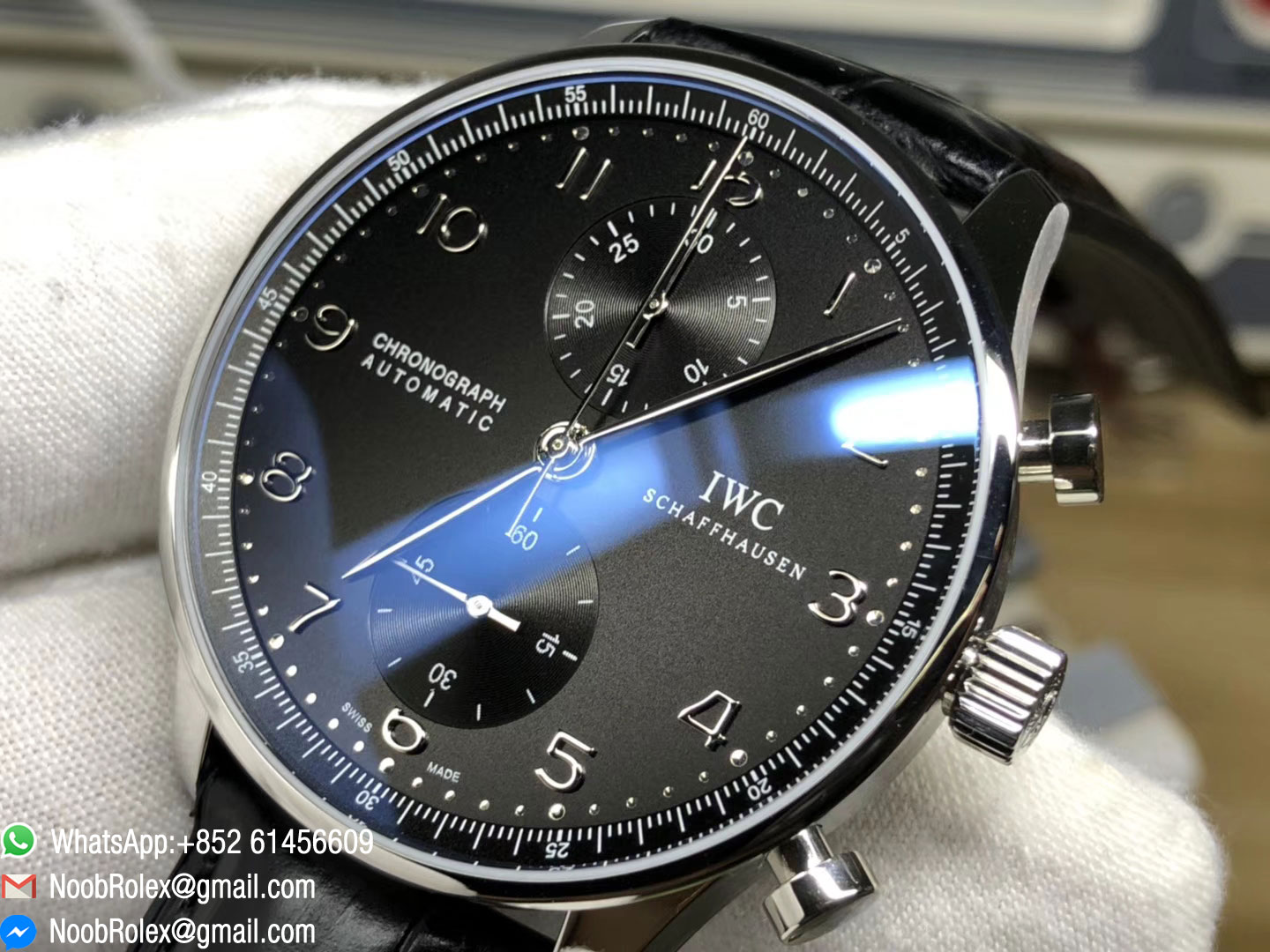 Order Now  Portuguese Chronograph Watch, Ref#: IW371447,  Black Leather Strap, Asain Chrono 7750 Automatic Movement, Same Thickness as Genuine. Made by ZF, Best 1:1 Rep watch.