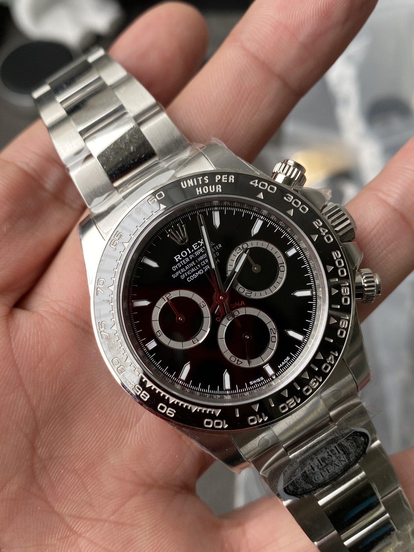 ● Bezel: Black ceramic tachymeter bezel with steel wrapped;
