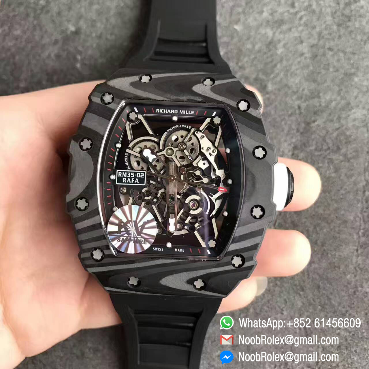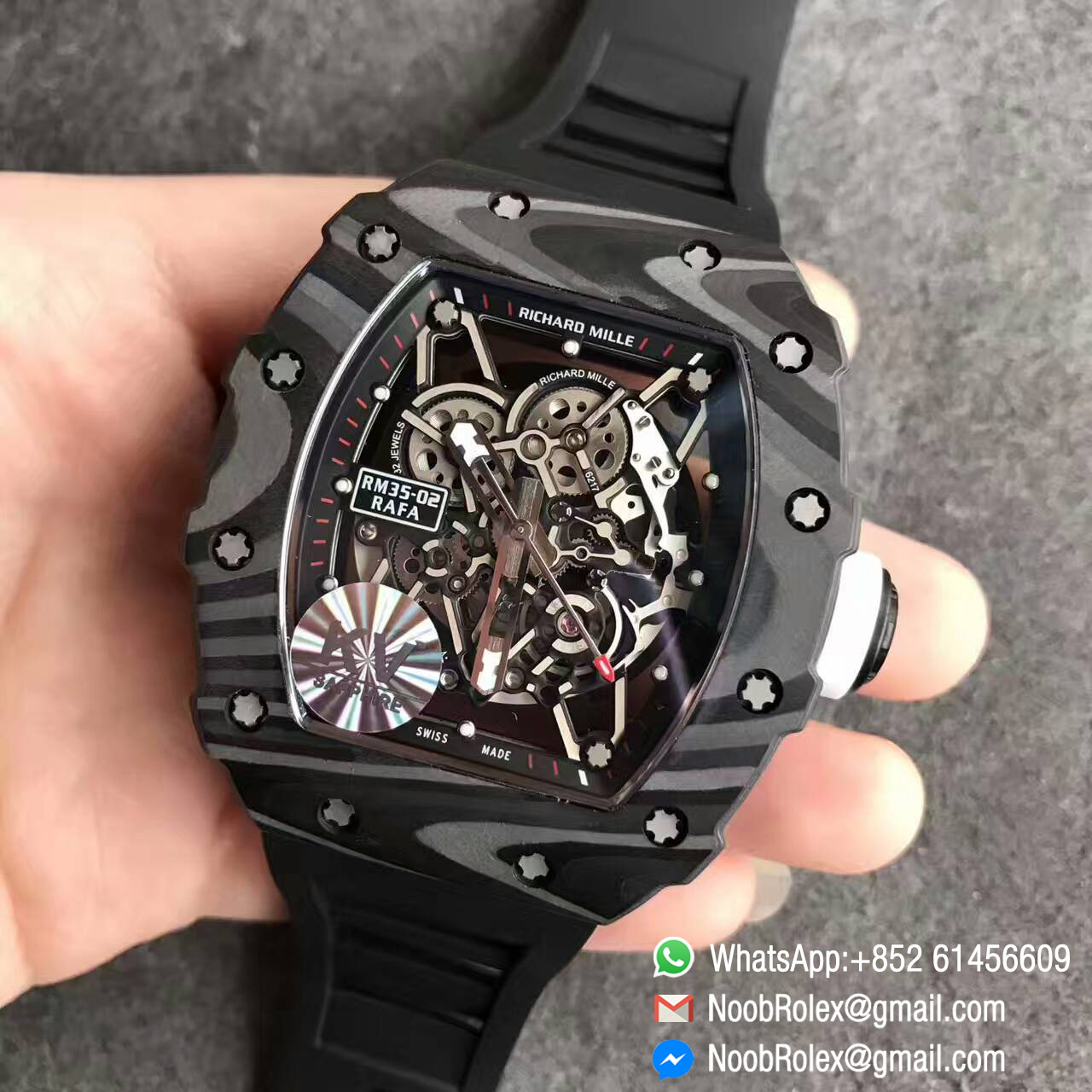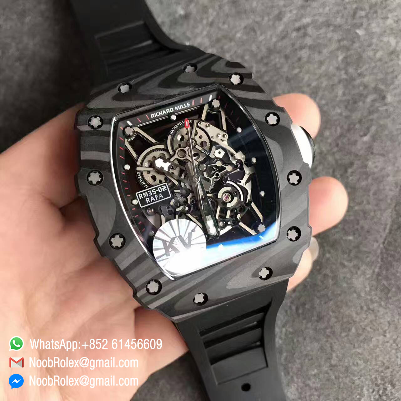 Order Now RM035-02 Rafael Nadal Forge Carbon Titanium Case, Skeleton Dial, and White on Black Rubber Strap, with MIYOTA8215 Movement, made by KV Factory, 2017 Best Edition.