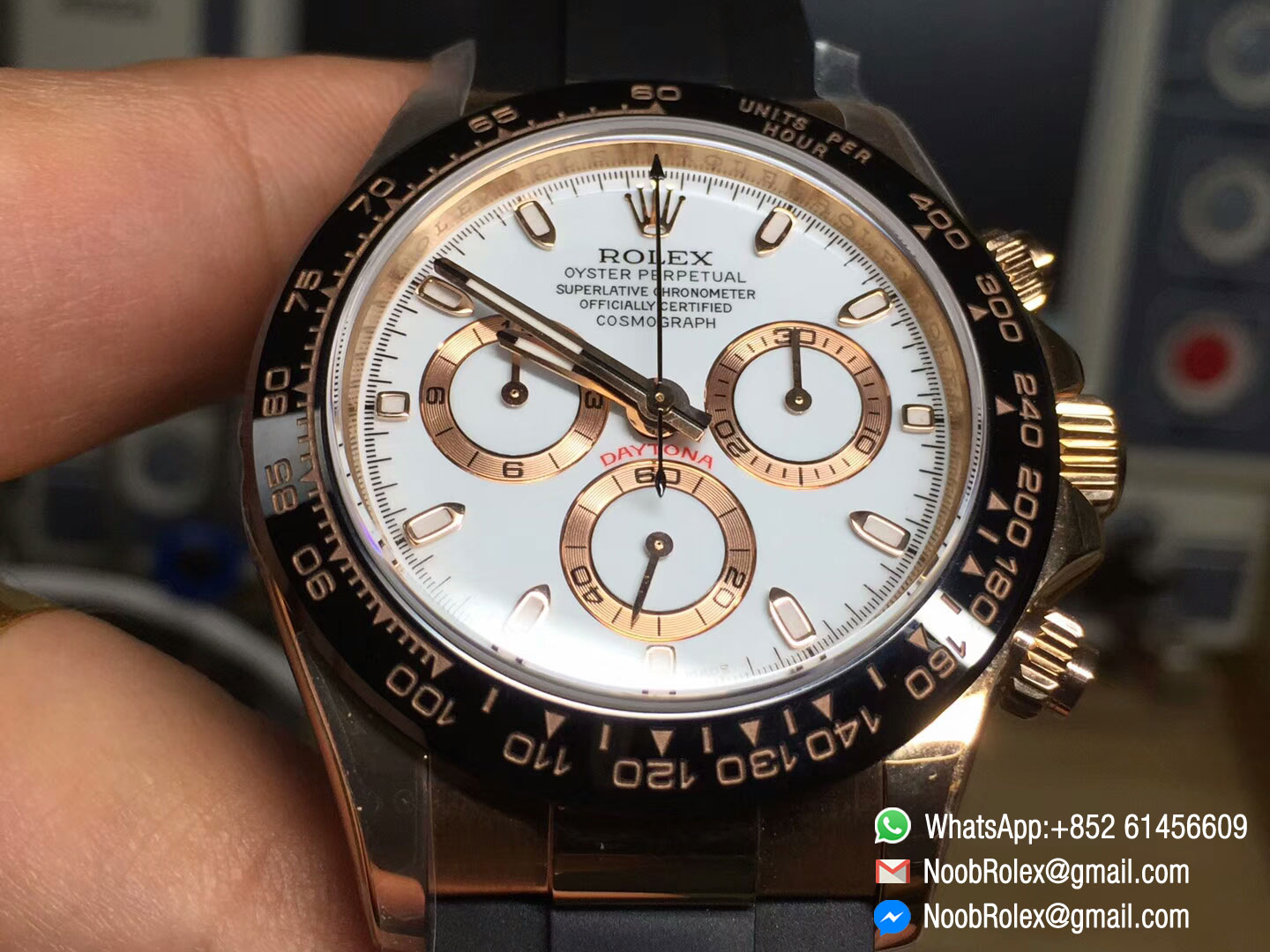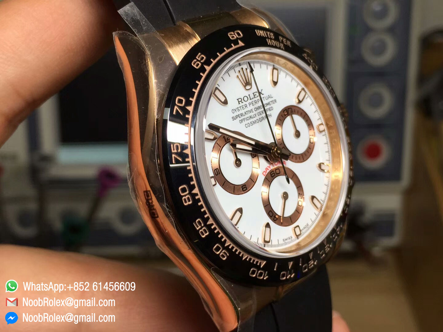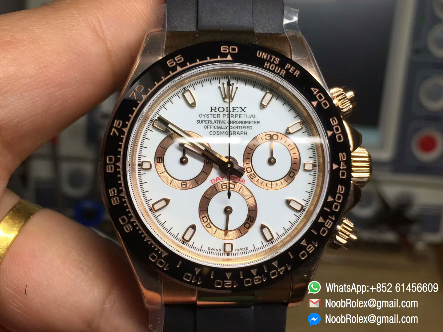 Order Now Daytona Watch 116515, Noob 1:1 Best Edition, Rose Gold Case & White Dial on Black Rubber Strap Asian 7750 Chronograph Automatic Movement.