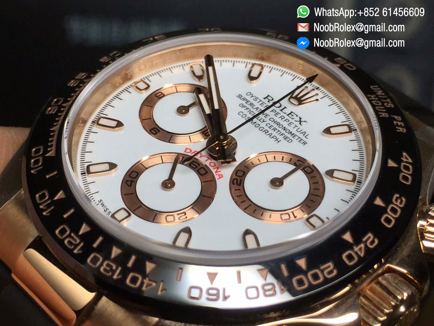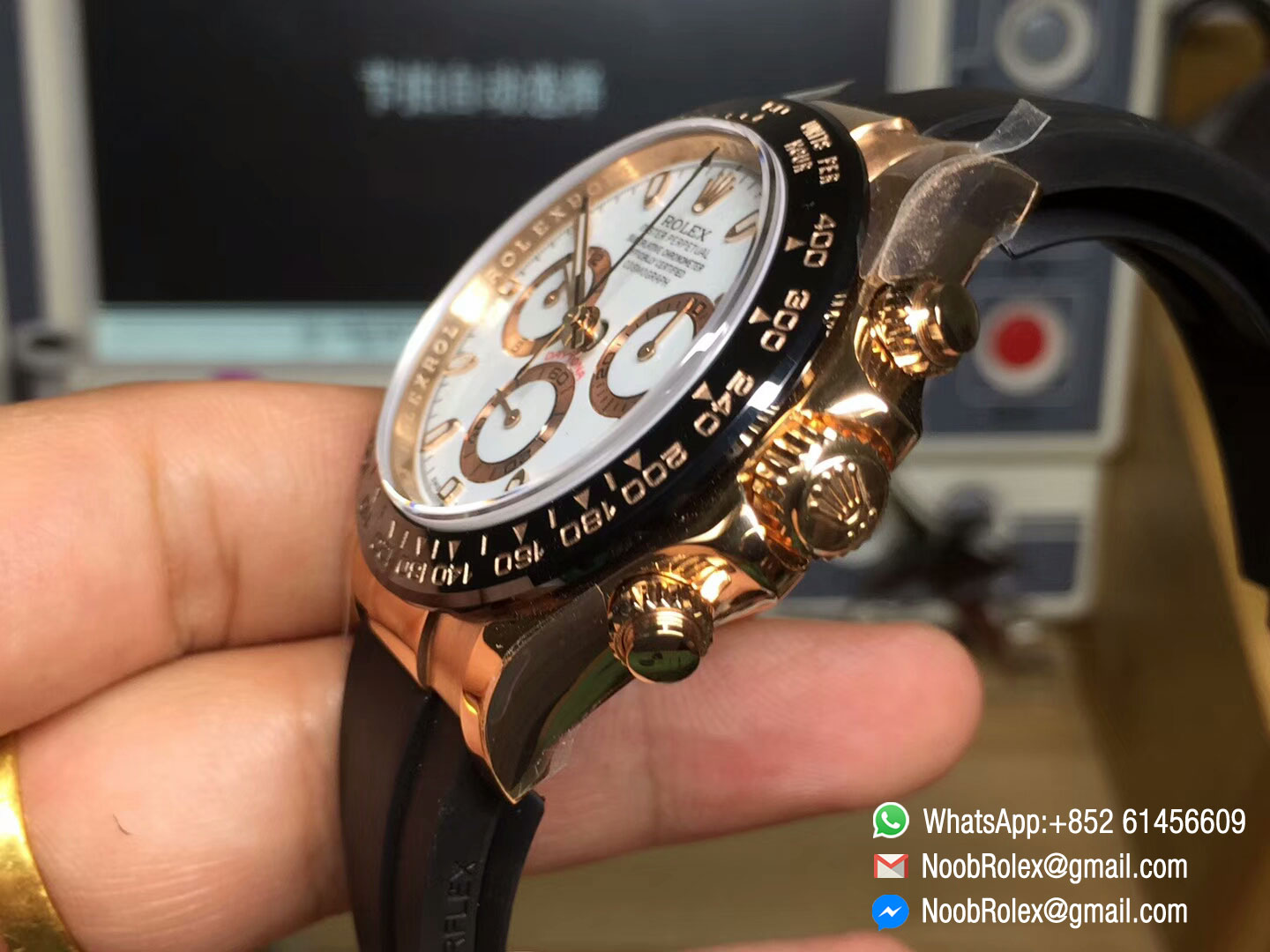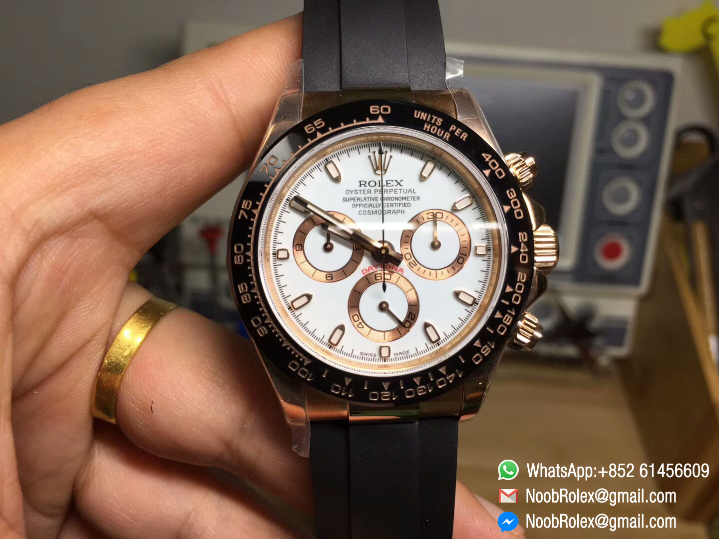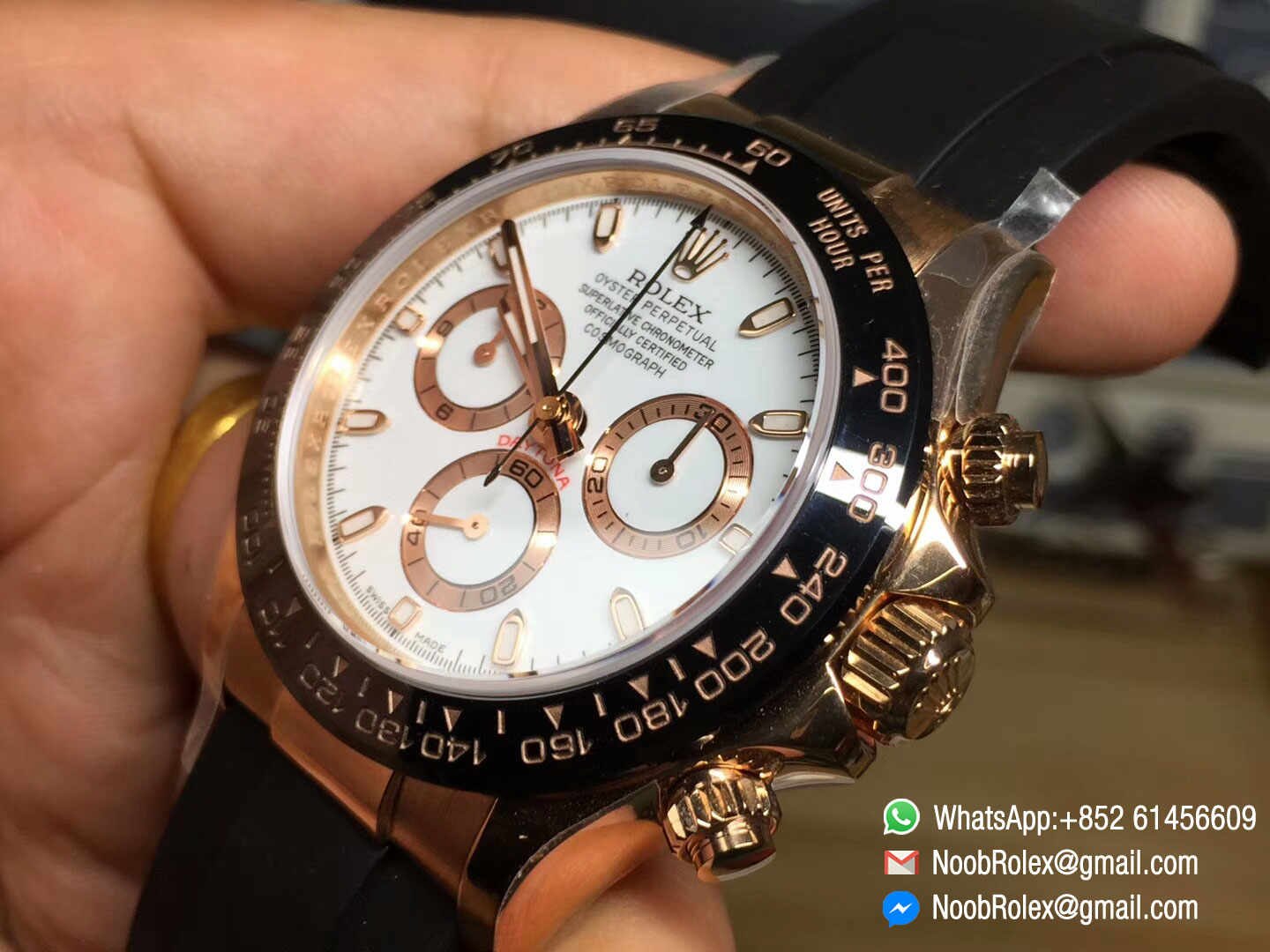 Order Now Daytona Watch 116515, Noob 1:1 Best Edition, Rose Gold Case & White Dial on Black Rubber Strap Asian 7750 Chronograph Automatic Movement.