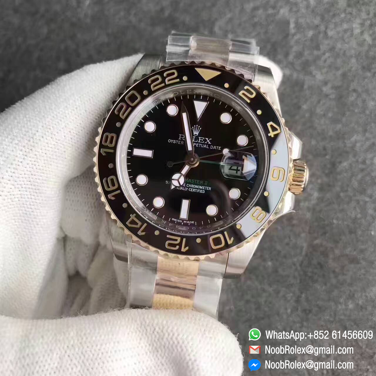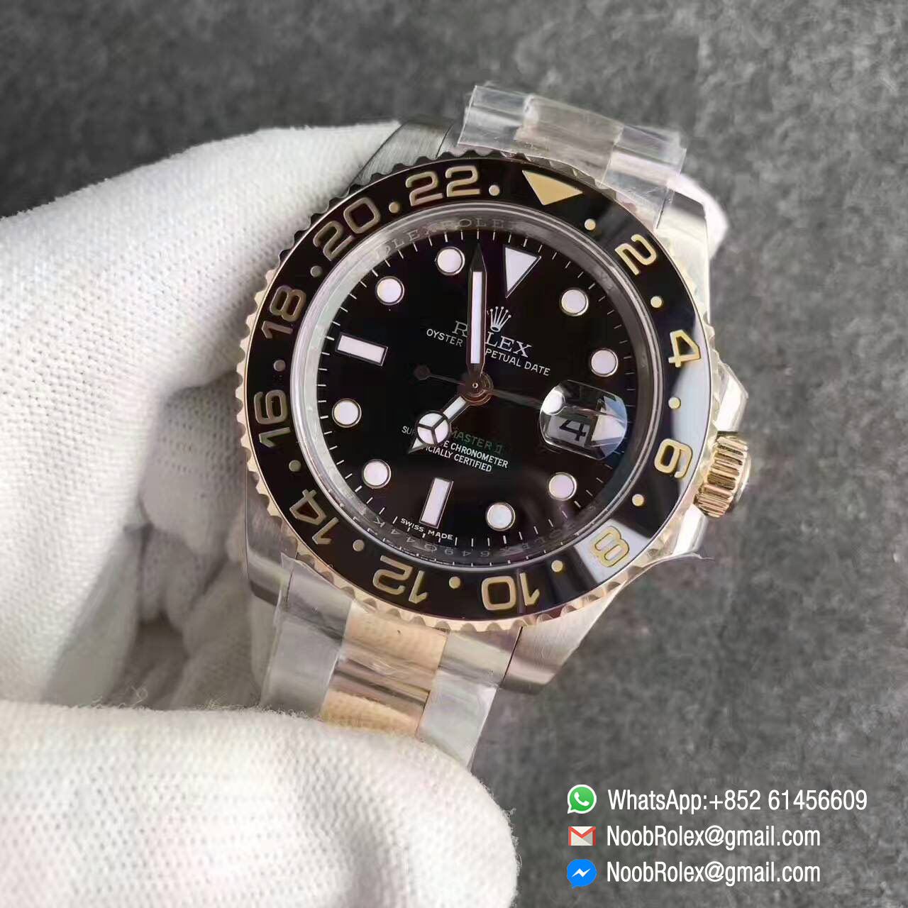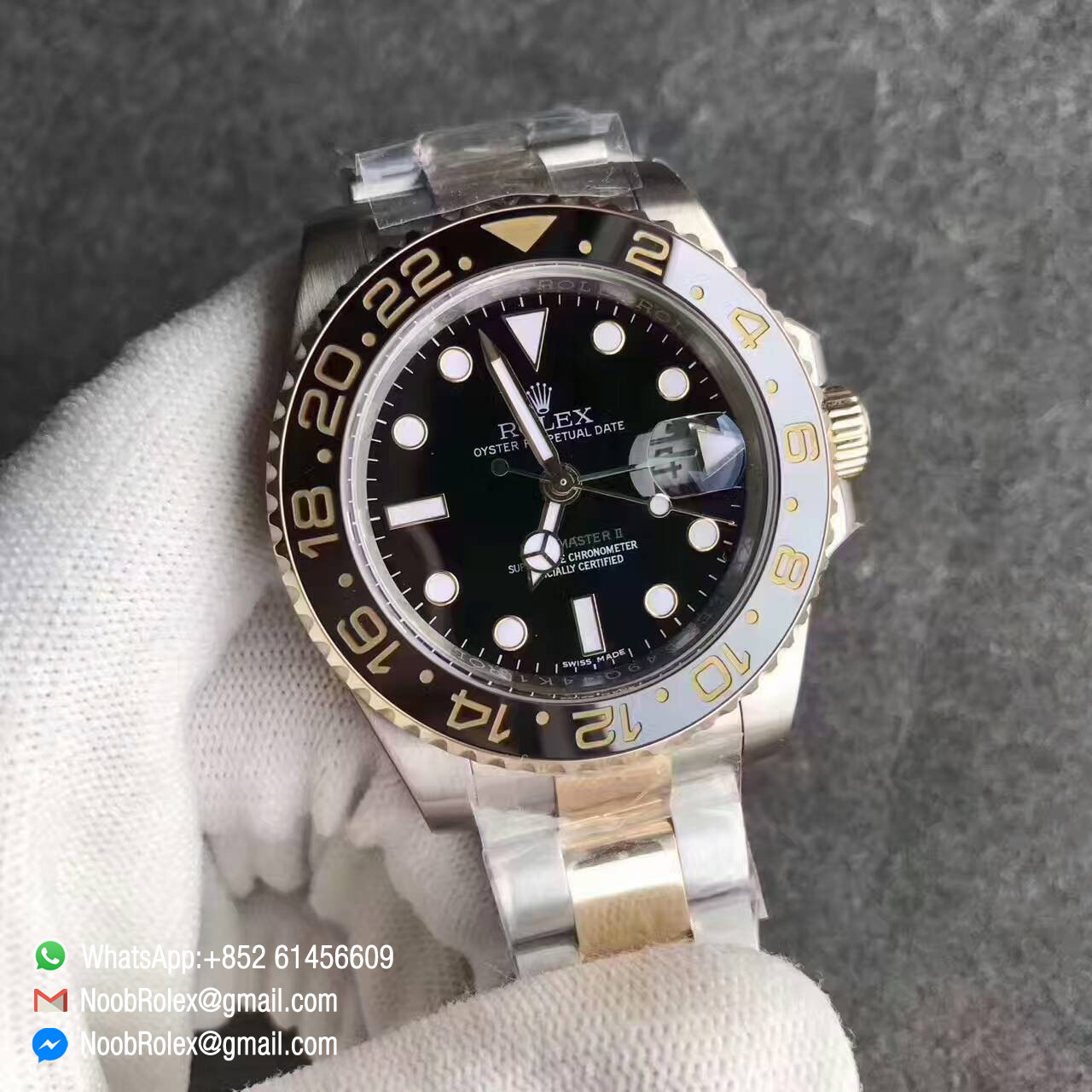 Order Now 2017 The newest GMT-Master II watch 116713LN, Black Ceramic, Thick Yello Gold Wrapped case, bezel and bracelet. Super Asian clone 3186 movement, Correct Hand Stack, 1:1 high quality, made by Noob factory in 2017.