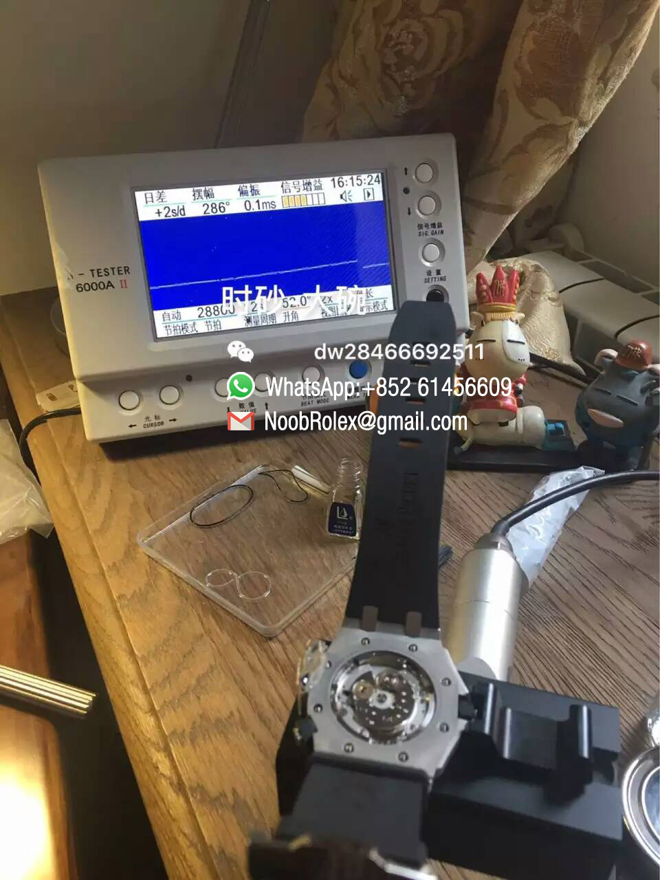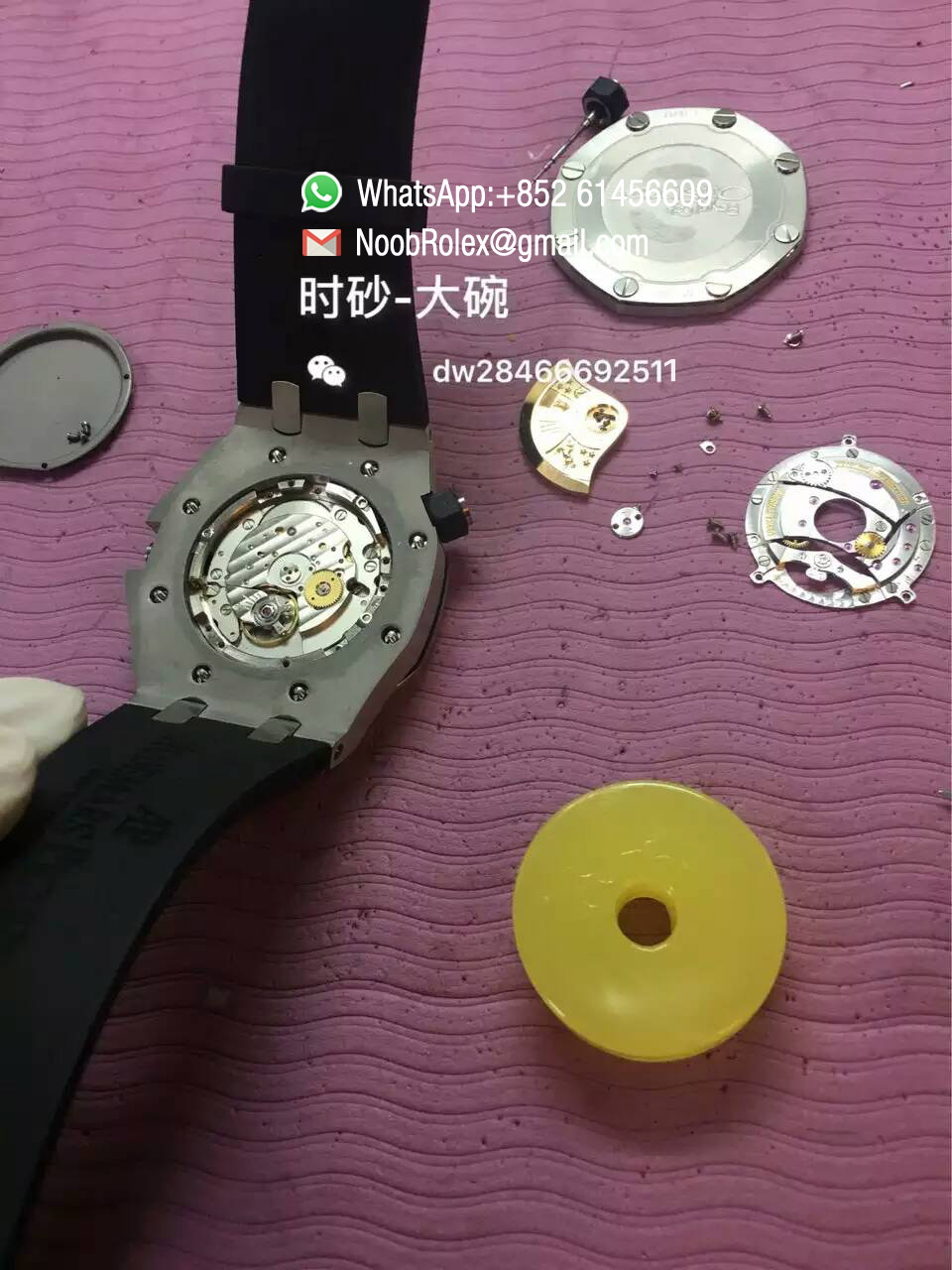 02) Movement: Base Movement: MIYOTA 9015 automatic movement; Decoration: Platinum plated movement plate and rotor which are made according to the genuine movement, the best looking AP Calibre 3120 Movement Clone at the moment.