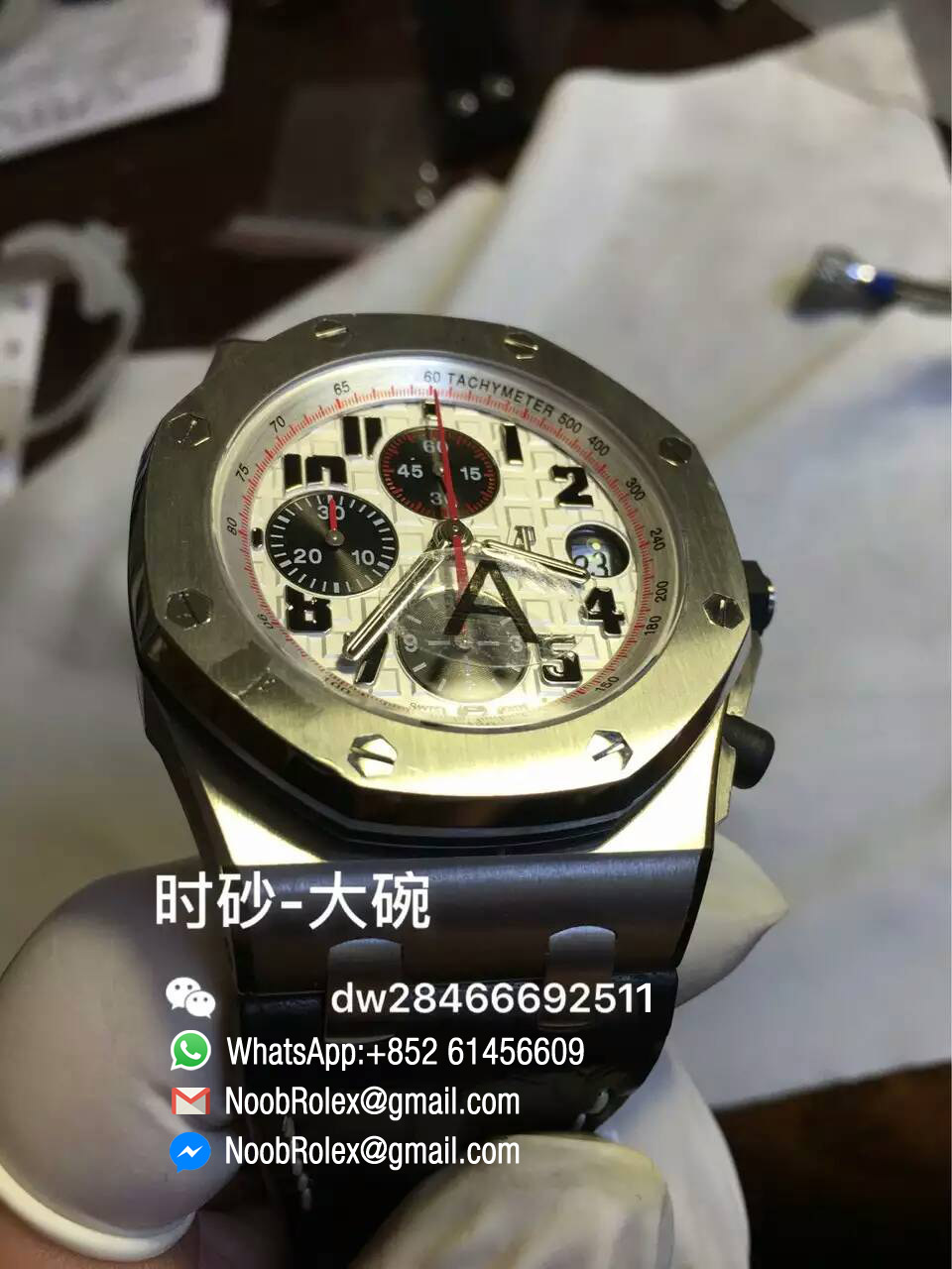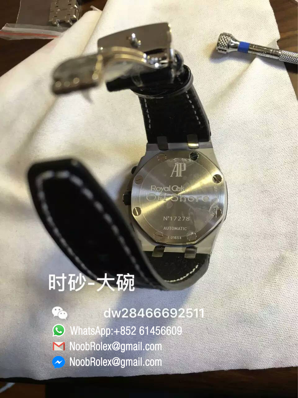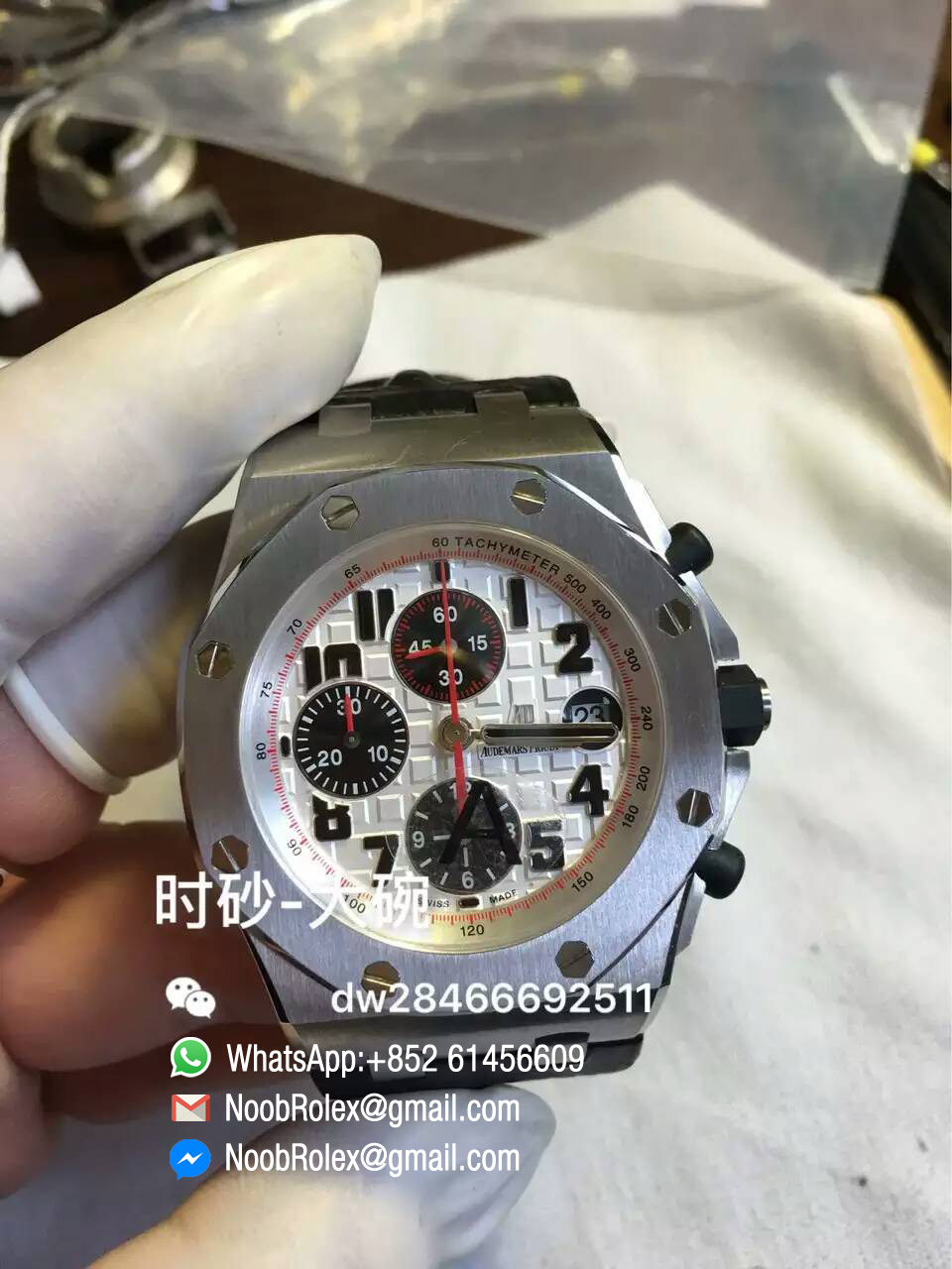 Order Now Selfwinding chronograph with date display and small seconds at 12 o’clock. Stainless steel case, silvered dial, black strap. Royal Oak Offshore Watch 26170ST, 42mm, JF Best Edition, Selfwinding, chronograph, Silver Themes on Black Leather Strap, Asian 7750 Movement.